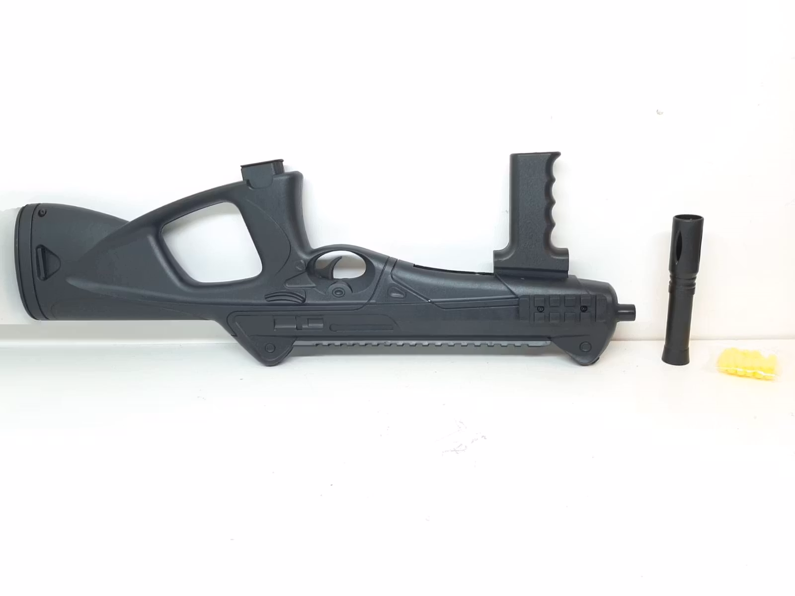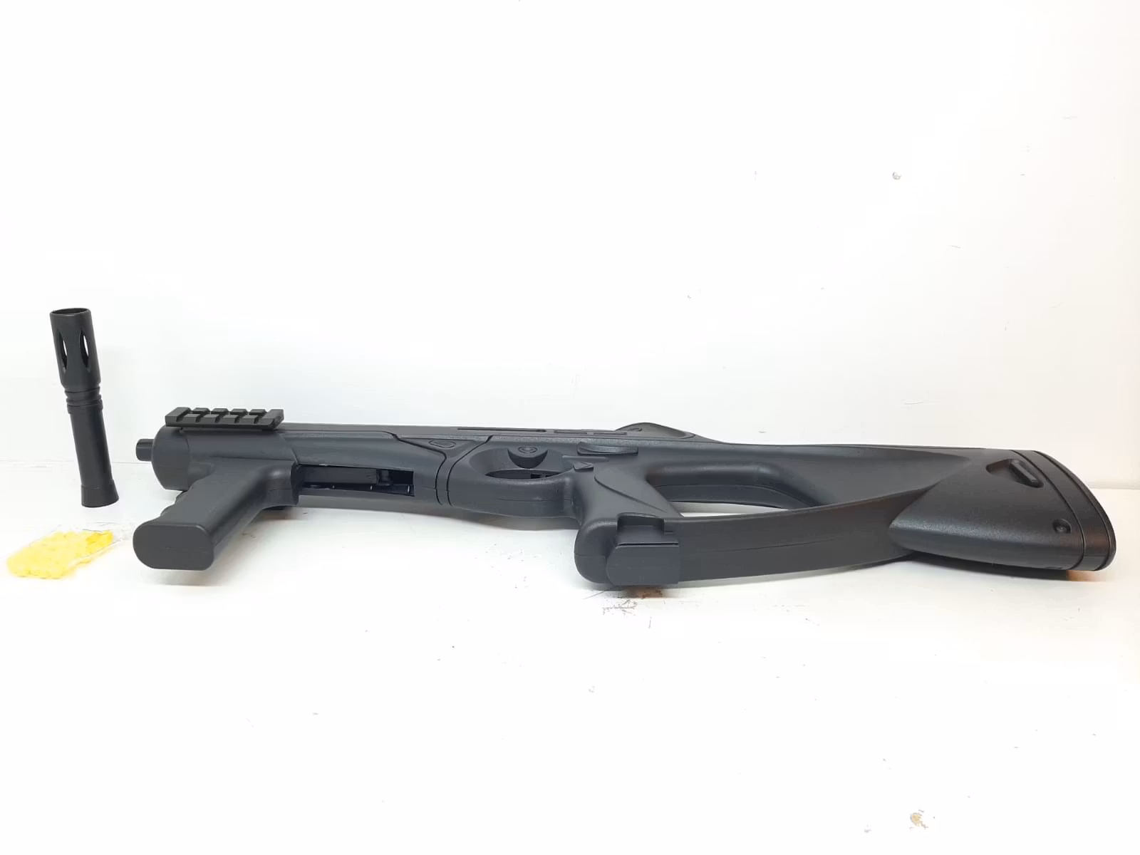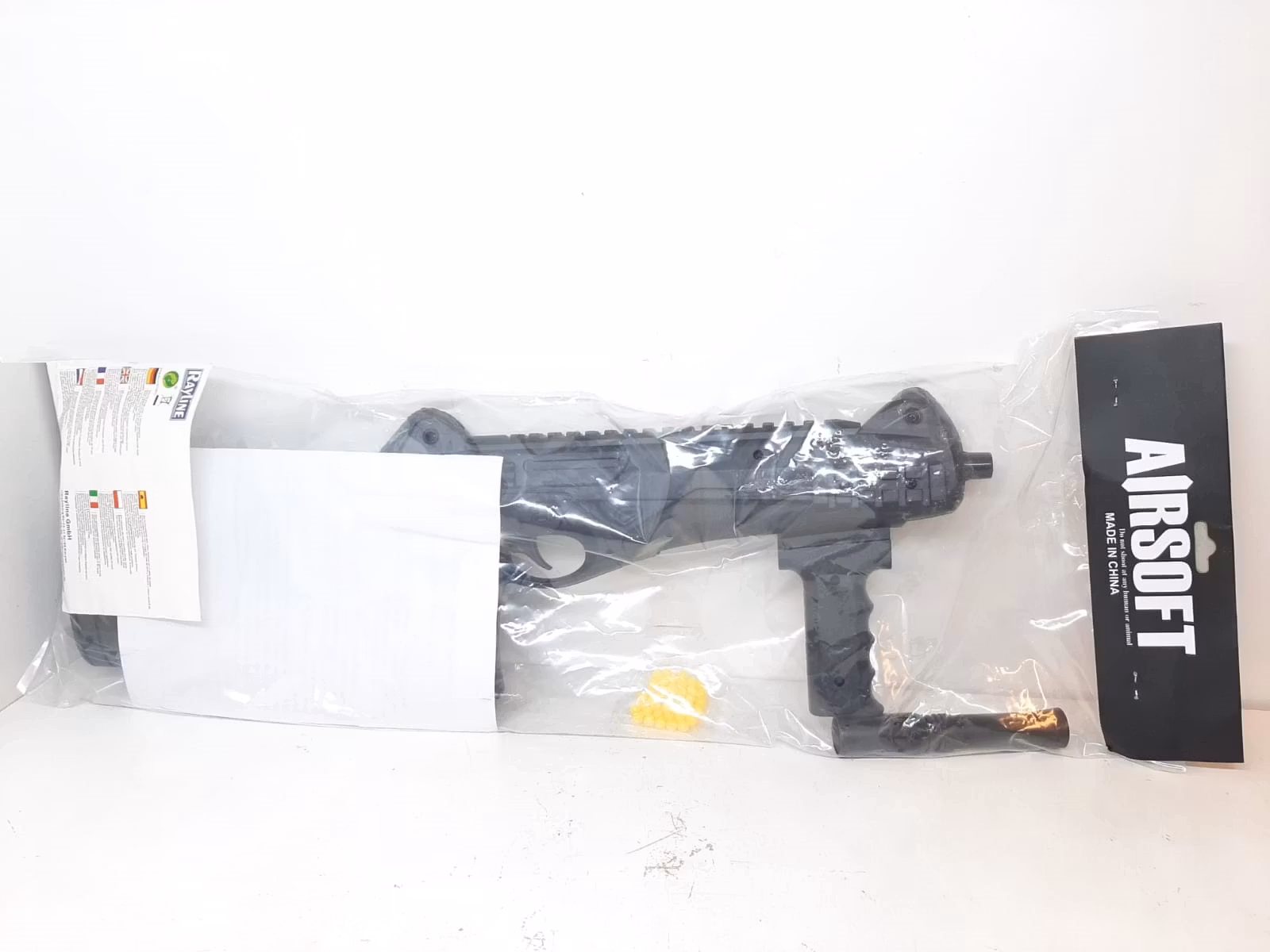 Du köper en Air Soft Maskingevär. Det medföljer en ljuddämpare som enkelt kan sättas på och tas bort (ljuddämparen är endast för prydnad och verkar inte som en riktig ljuddämpare). Magasinet går inte att ta ut då den sitter fast. För att fylla maskingeväret med skott så öppnar man ett lock där skotten läggs i (se bilder). Tillverkad i Kina.