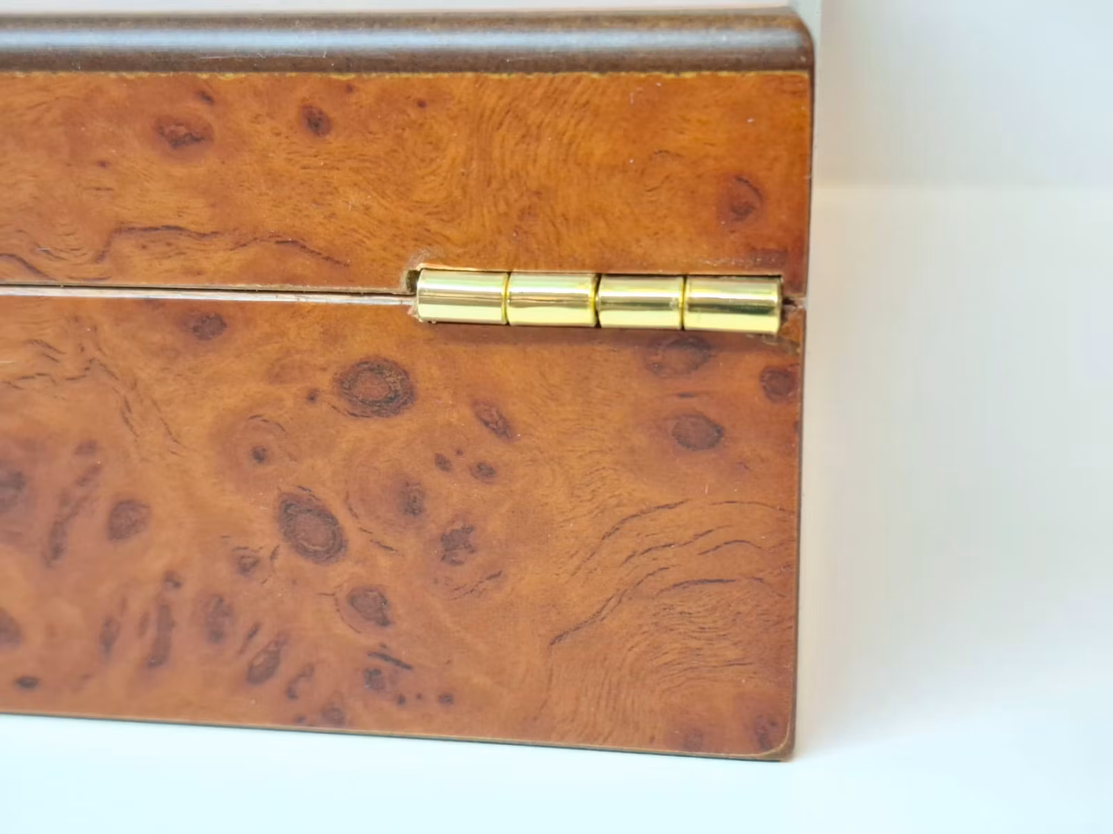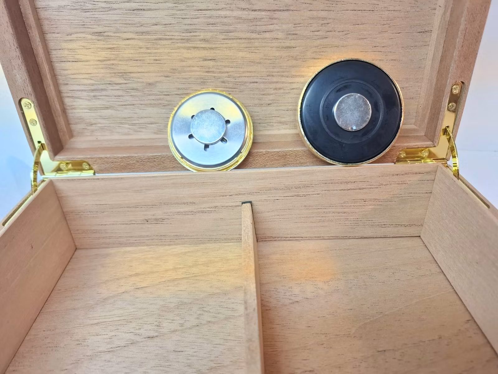 Du köper en cigarr humidor av märket Sikarlan, som har plats för cirka 15 - 25 cigarrer (beror på storleken). På humidorens undersida finns len fintyg som skyddar. Det medföljer en hygrometer samt en fuktare där baksidan på dessa är magnetisk (se bilderna). I humidoren finns också en träskiva som kan användas för att skapa en mellanvägg i humidoren.