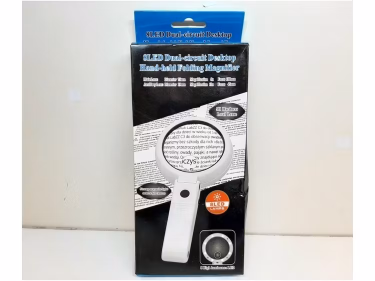 Förstoringsglaset passar utmärkt på skribordet eller arbetsbänken. Produkten kommer i sin originala kartong. Det medföljer en manual på engelska, USB-kabel för laddning av LED-lamporna, en duk av lentyg för rengöring av linserna samt två AA-batterier (märken kan skilja).