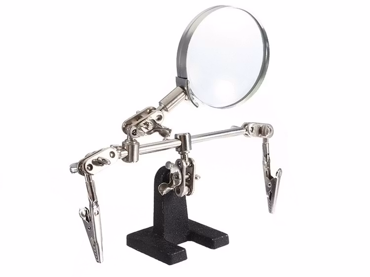 Du köper ett förstoringsglas som sitter fast på en hållare. Hållaren har också två klämmor. Detta verktyg är väldigt praktiskt att använda vid exempelvis reparation av klockor och urmakeri eller vid andra precisionsarbeten. Klämmorna används för att greppa tag om föremålet som man vill förstora och arbeta på, så att du har dina händer helt fria och inte behöver hålla i föremålet. Förstoringsglaset har en förstoring upp till 10 gånger (x10). Förstoringsglaset kan snurras runt 360 grader. Hållaren är gjord av metall. Produkten kommer omonterad i sin originala kartong.