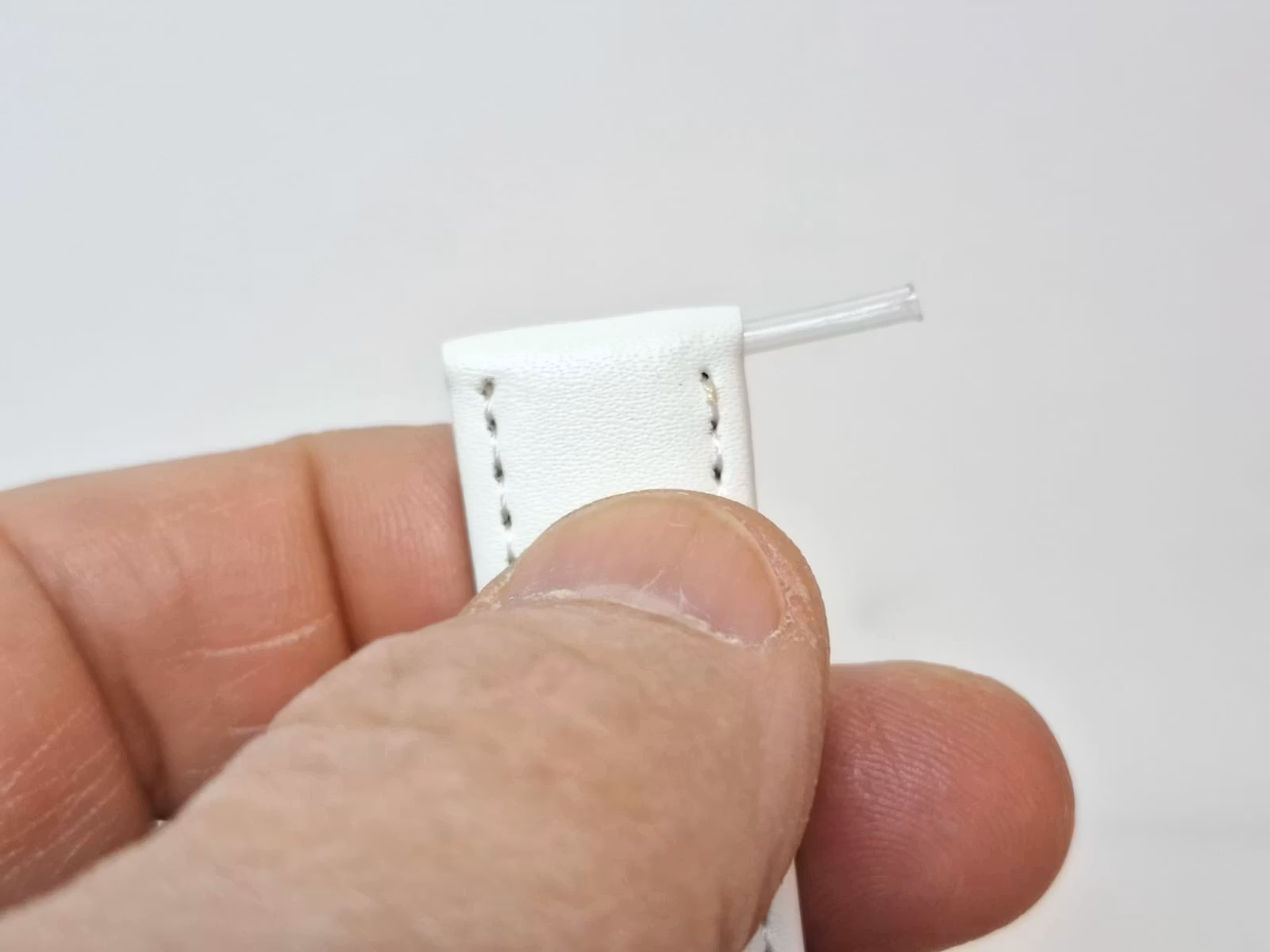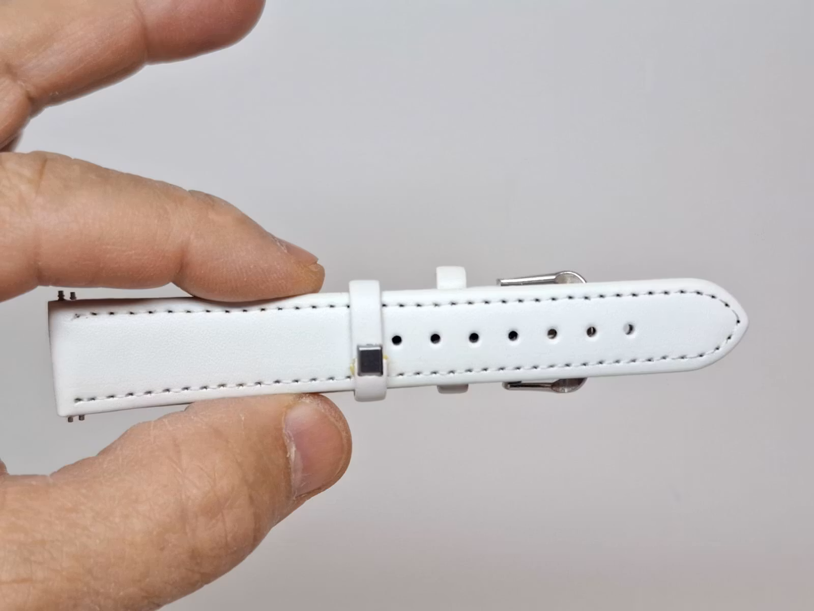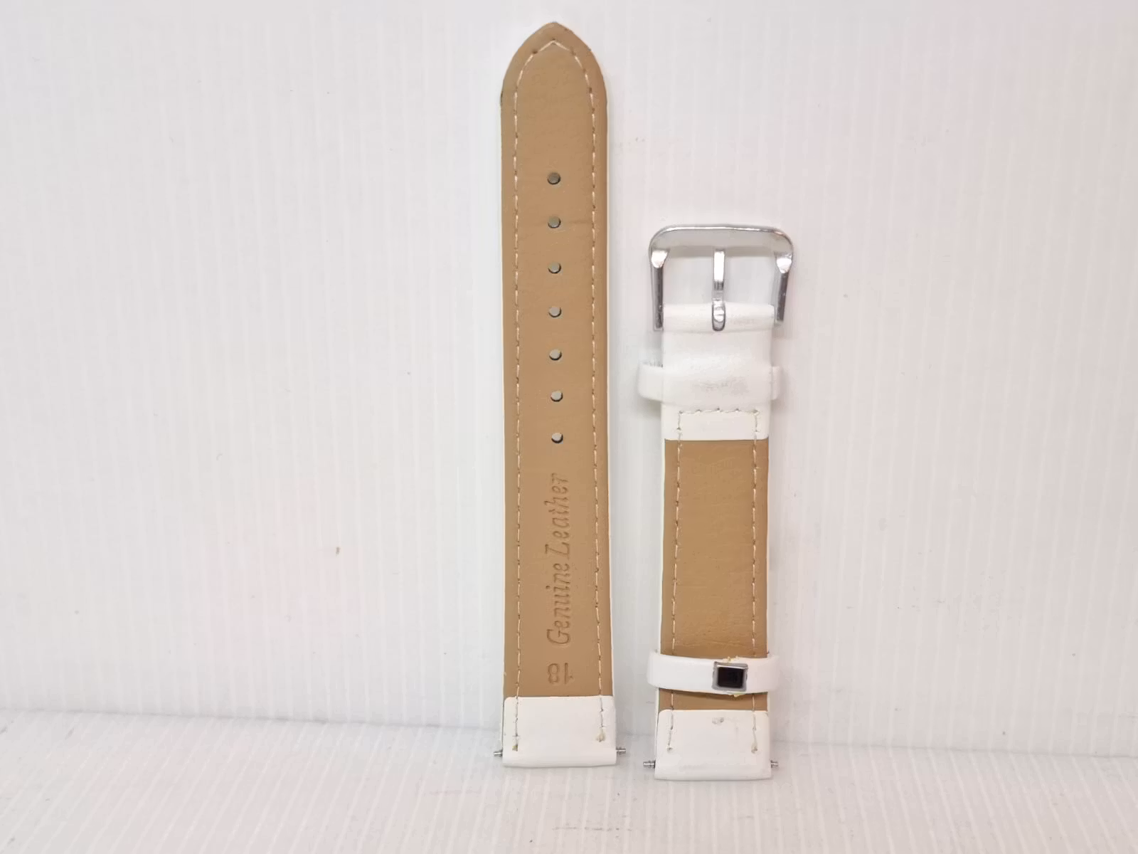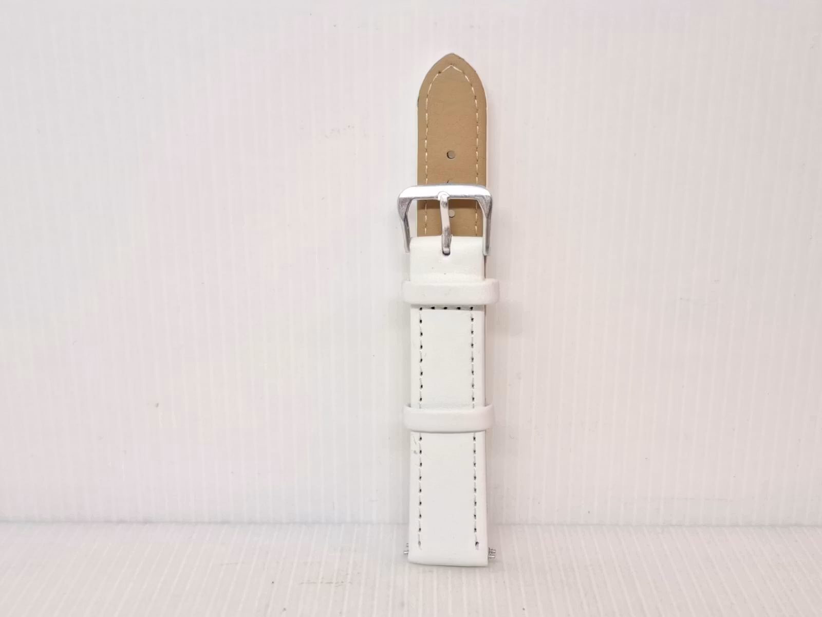 Du köper ett armband som kommer i vit färg. Armbandet är tillverkade i Hong Kong av äkta läder. Spännet kommer i silver färg. Det medföljer två stycken bandstift. Se bilder.