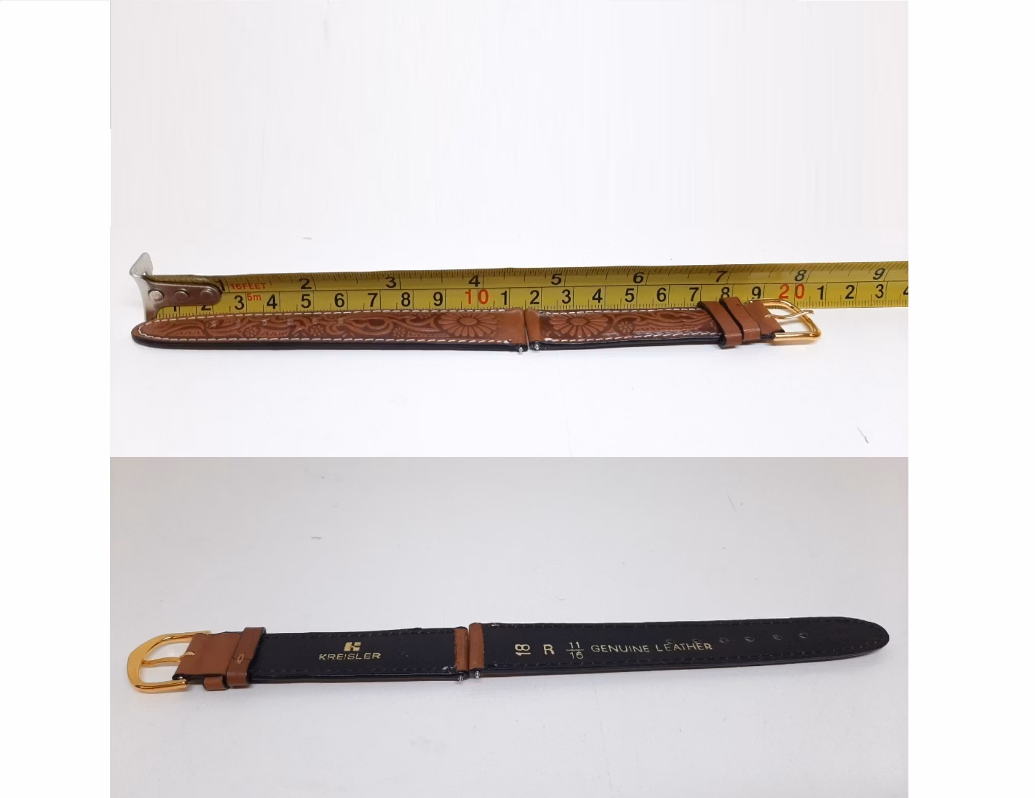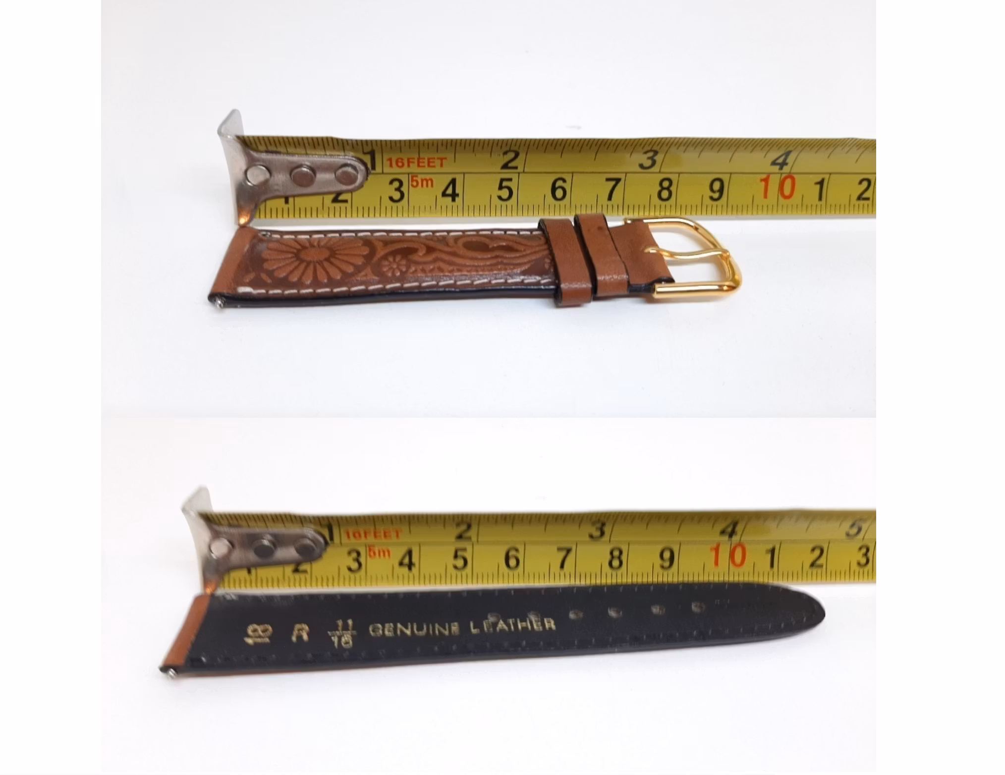 Du köper ett armband i brun färg med mönster (så kallat Cowboy mönster) och har vit söm-kant. Armbandet är tillverkad i läder. Armbandet har ett spänne i guld färg. Den passar både dam- och herrklockor.