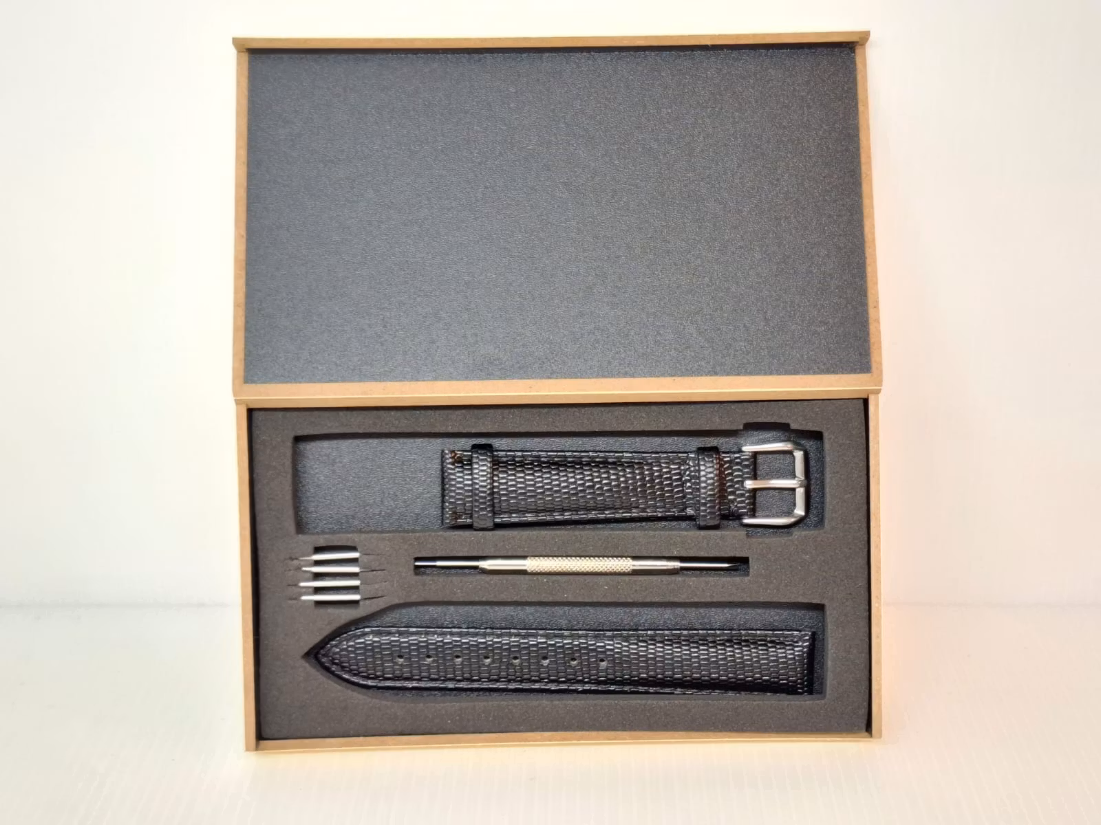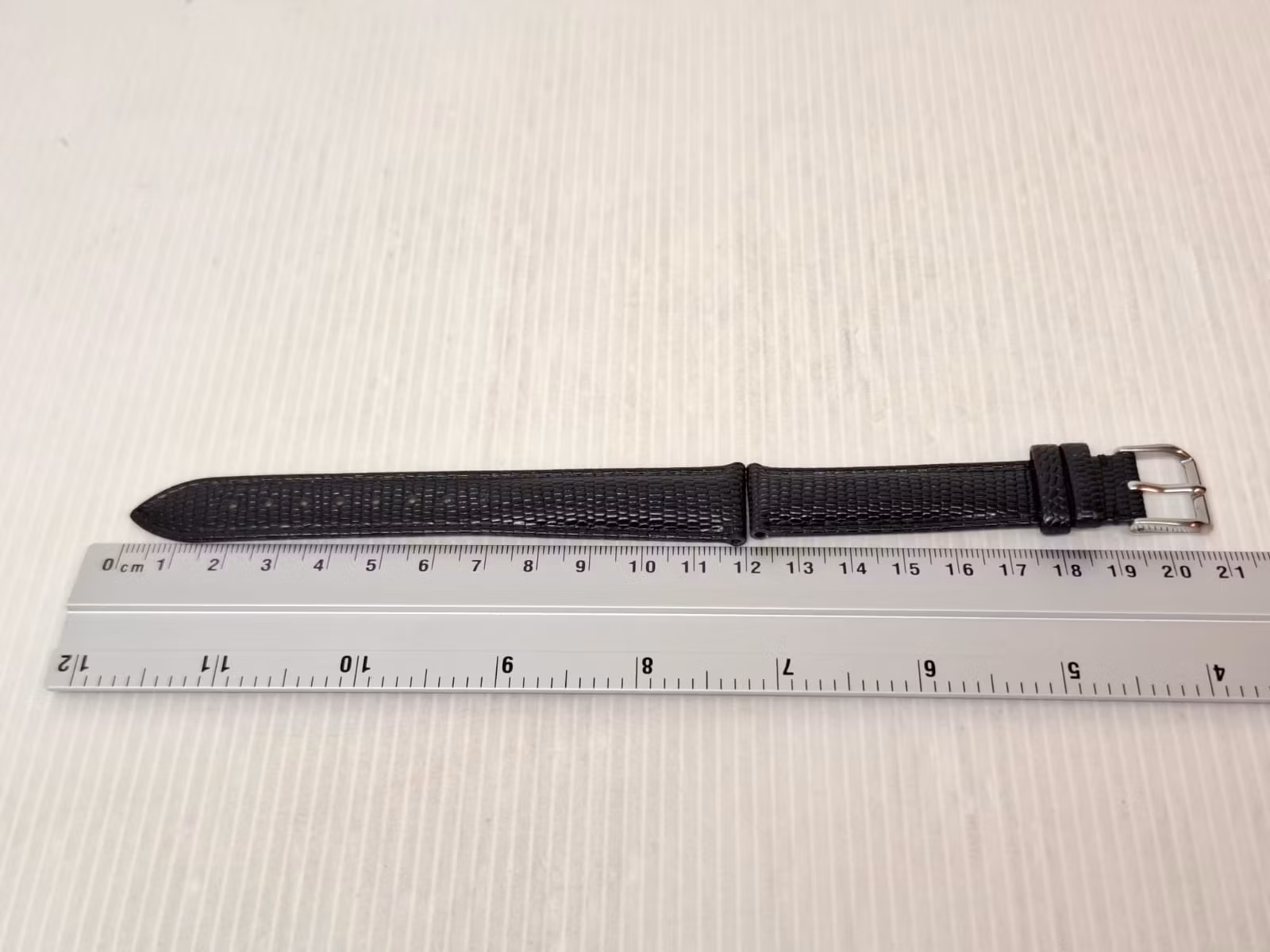 1) Ett armband i svart färg. Armbandet är tillverkad av äkta läder (kalvskinn) i hög kvalité från Hong Kong. Armbandet har ett mönster som påminner om mönster som ormar och ödlor har (se bilderna). Det svarta armbandet har ett spänne i silver färg. Armbandet passar till både dam- och herrklockor. Bredden på armbandet är 18 mm och bredd vid spännet är 16 mm. Längd på armbandet (den långa delen) är ca 12 cm. Längden på armbandet (den korta delen) är ca 9 cm (inklusive spänne, se bild).