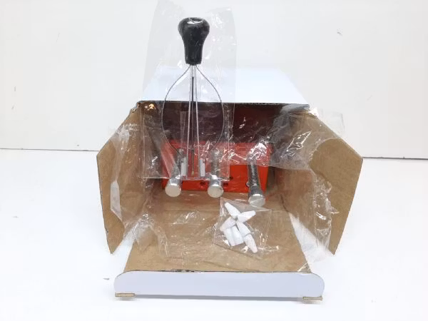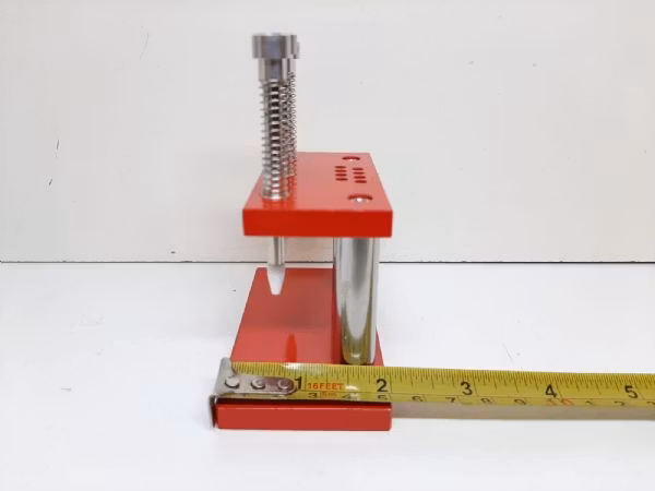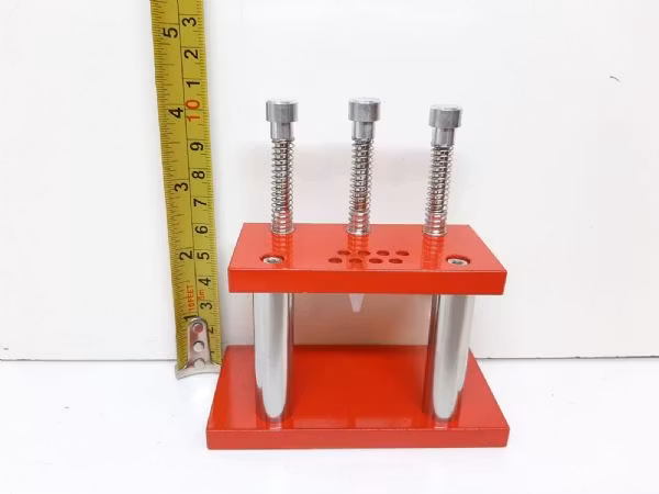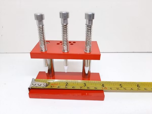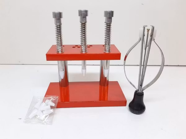 1) Tre vispressar som är ett praktiskt verktyg för att säkert och försiktigt kunna pressa fast/tillbaka visarna. Klockan hålls fast på plats i mittkolven med hjälp av vis press och som hjälper till att skydda och inte skada klockan. Materialet på vispressen är av rostfritt stål och toppen är av plast.