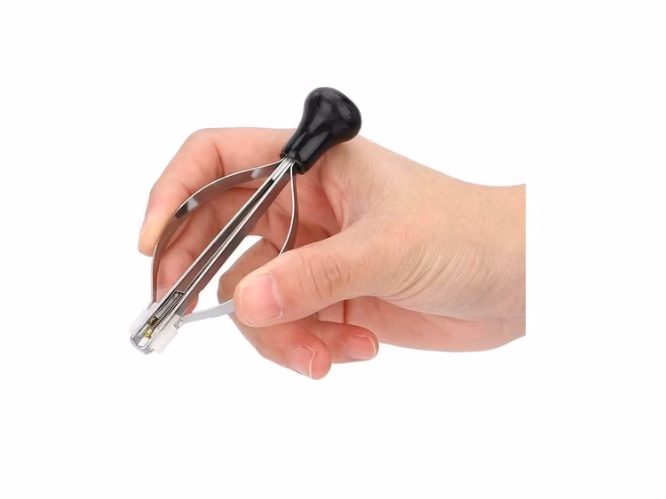 3) Tre stycken bandstift-nålar som är ämnade för bandstift-borttagaren för länkar. Välj den tjocklek på nålen som passar storleken på bandstiften och placera sedan nålen i bandstift-borttagaren.