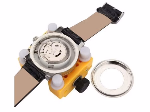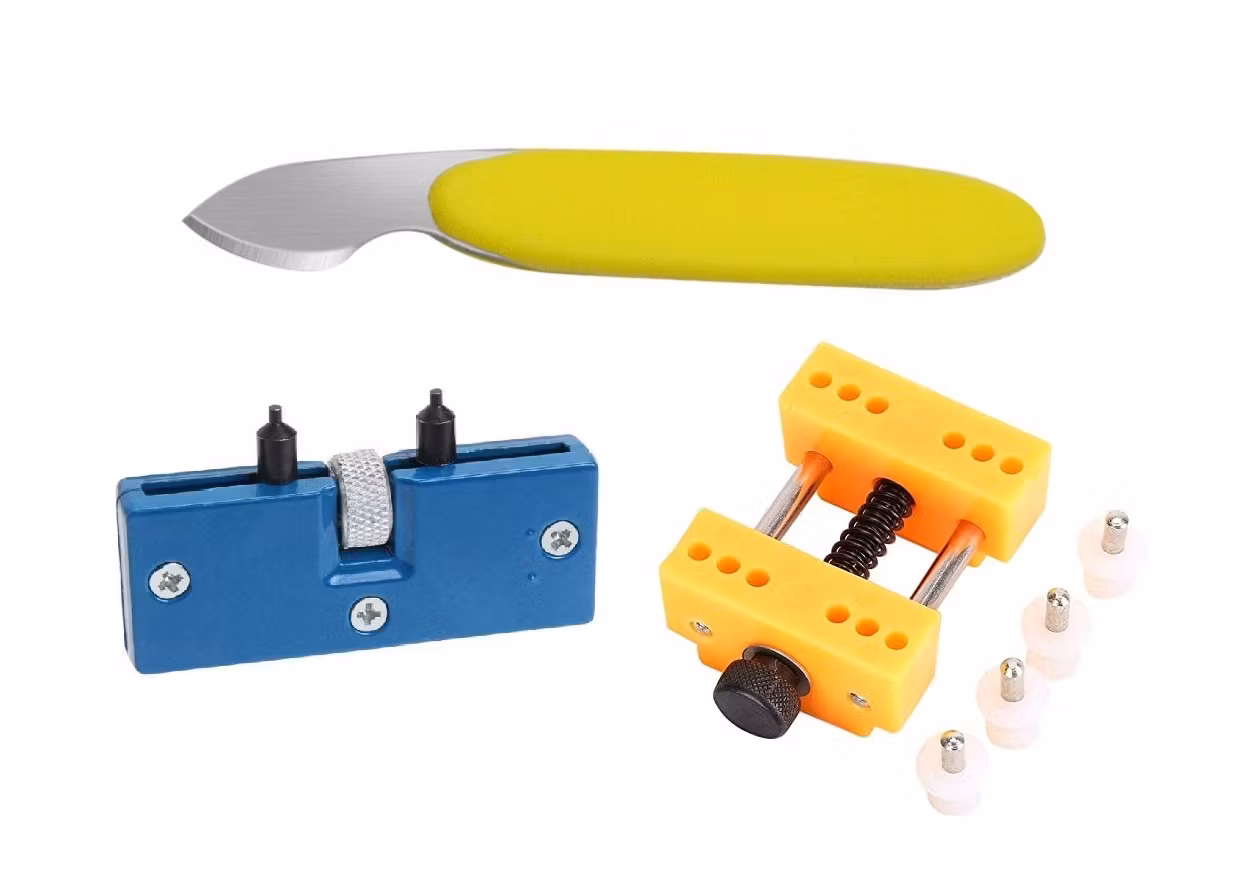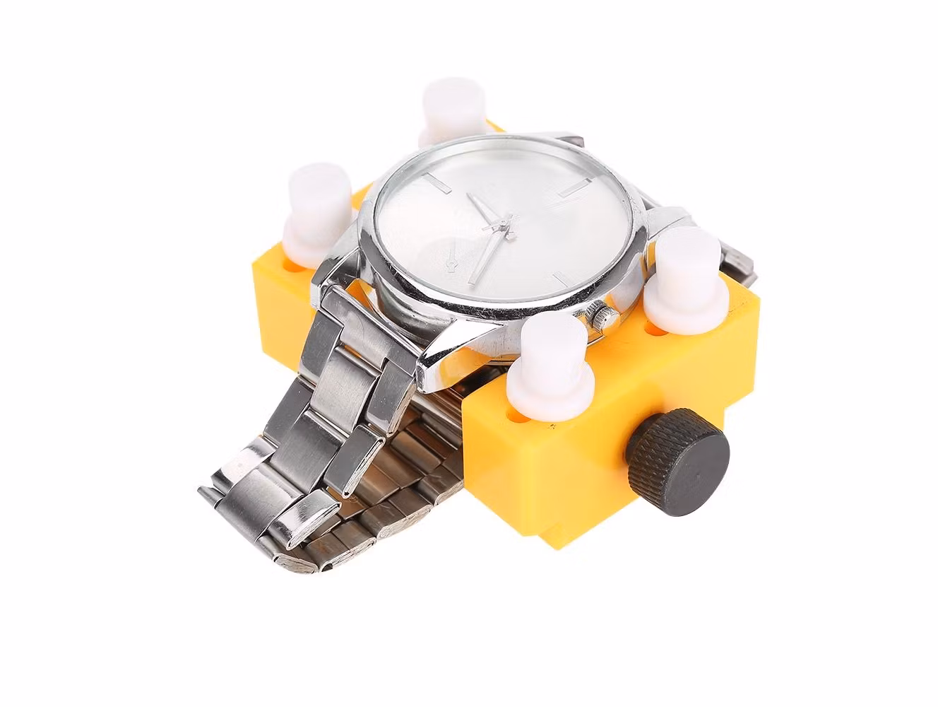 1) Ett skruvstäd / klockhållare till klocka. Placera din klocka på klockhållaren för att hantera klockan säkert och smidigt när du exempelvis reparerar den, ska öppna boetten, med mera. Med sina plaststift så repas inte klockorna. Med de vita plaststiften så kan man ställa dessa i olika positioner för olika storlekar. Kommer i gul färg.
