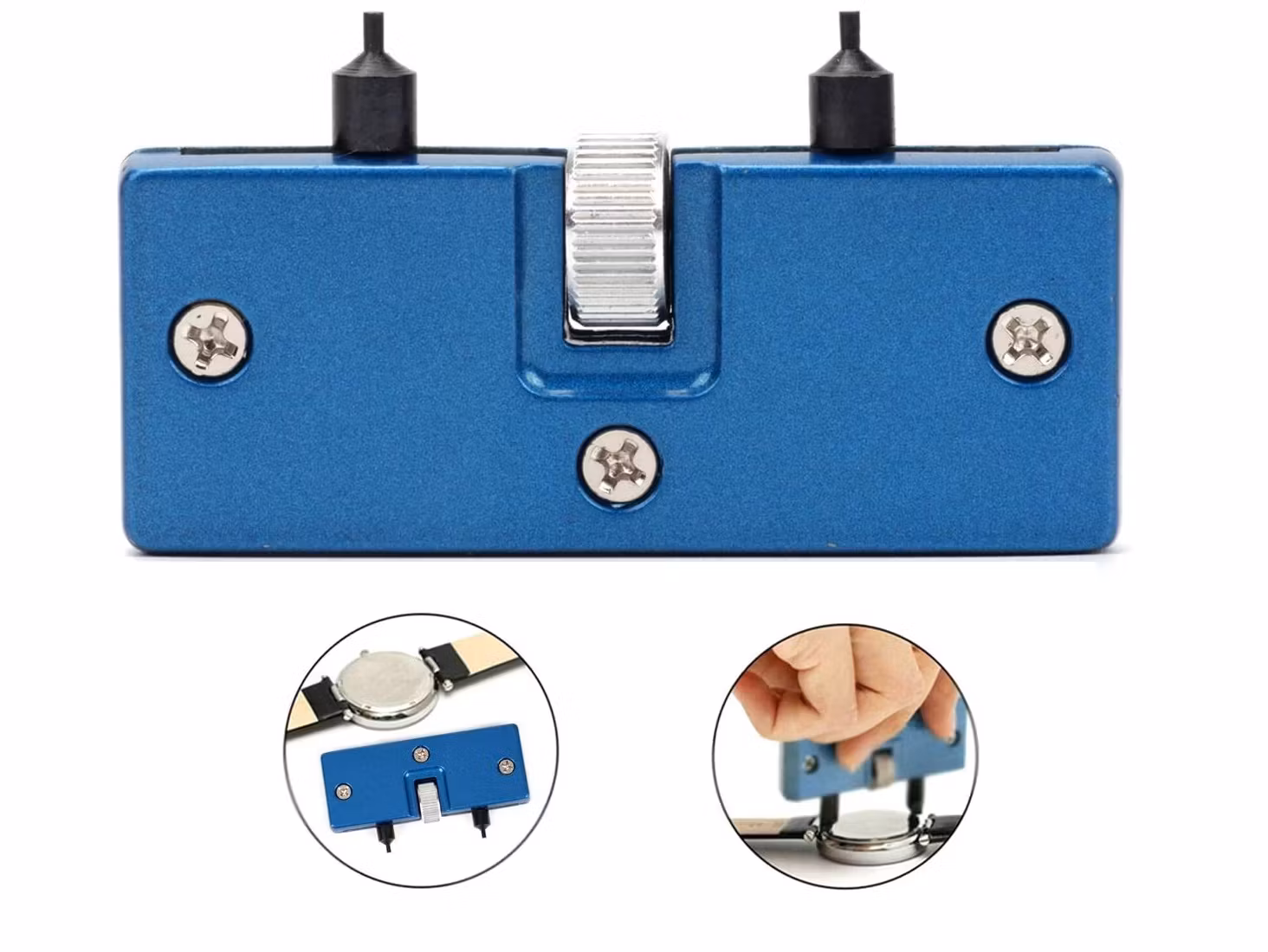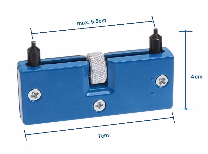 3) En boettöppnare som har runda hållaren (se bilderna). Detta klockverktyg används för att öppna locket på baksidan av din klocka. Material: Stål.