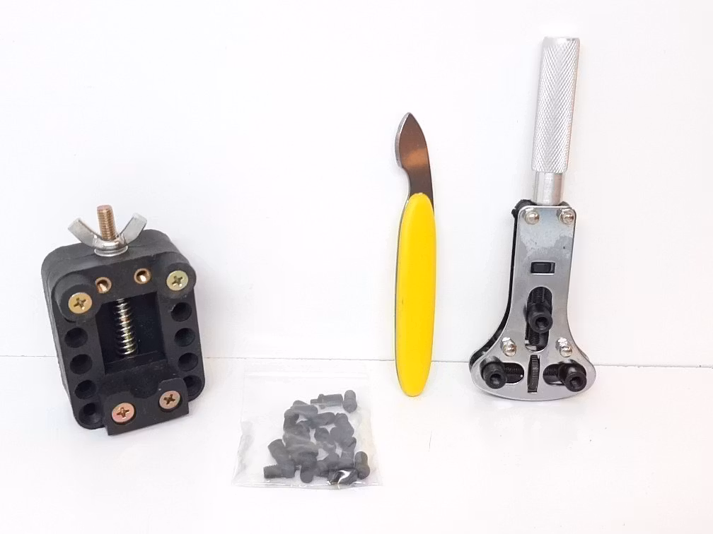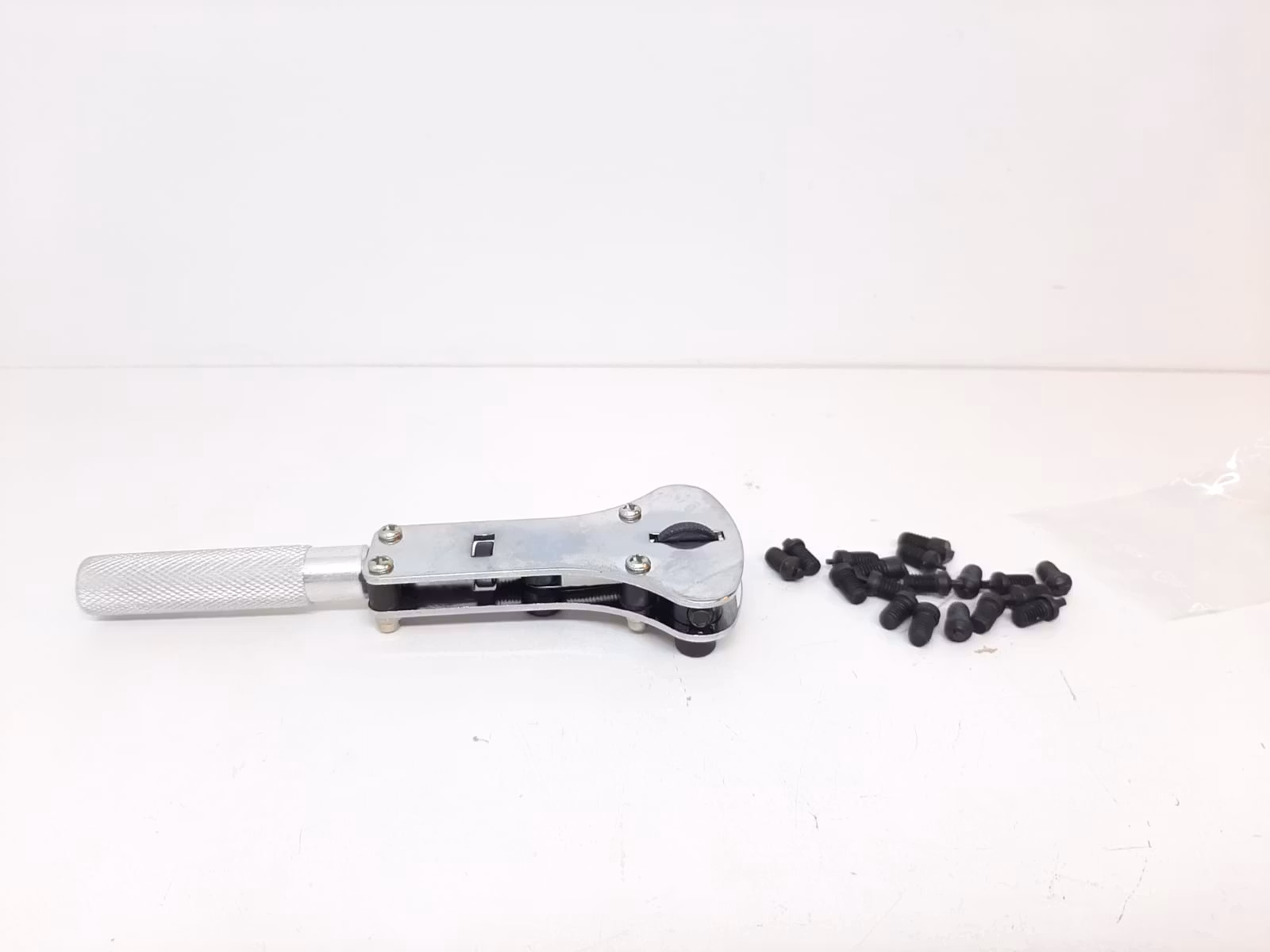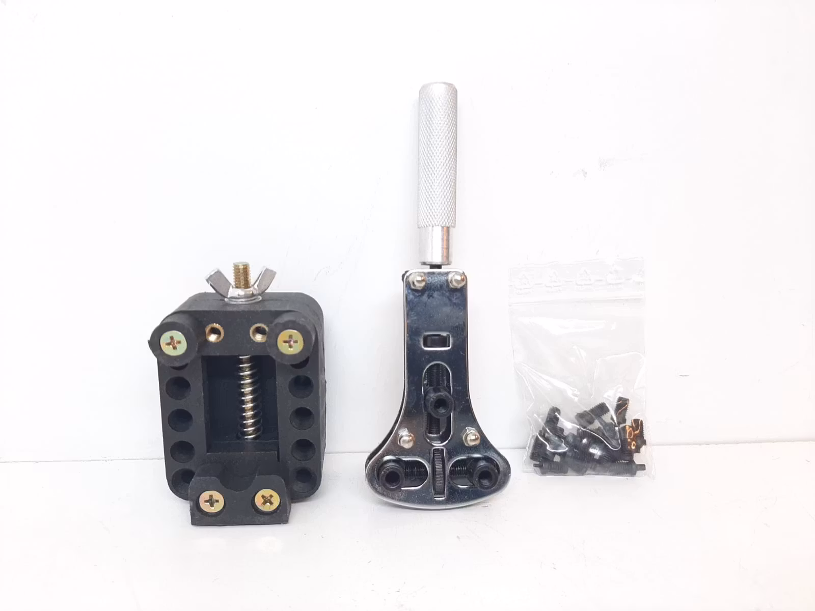 1) En justerbar boettöppnare. Ställ in måttet i denna boettöppnare och använd den för att snurra av boetten på klockan. Måtten som går att ställa in går allt från 16mm till 32mm i diameter för boetter (cirkamått). Den är till för klockor och urverk med gängade boetter. Det medföljer 18 olika munstycken / bits som byts ut beroende på boettens storlek. Munstyckenas storlekar är 3st platta, 3st fyrkantiga, 3st trianglar och 9st runda. Boettöppnaren är gjord av metall. Boettöppnaren kommer i ett plastfodral.