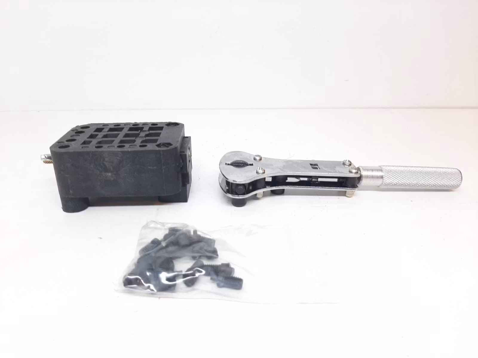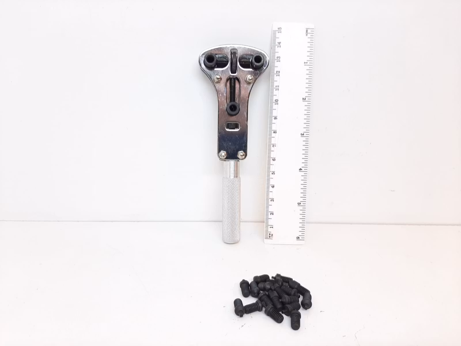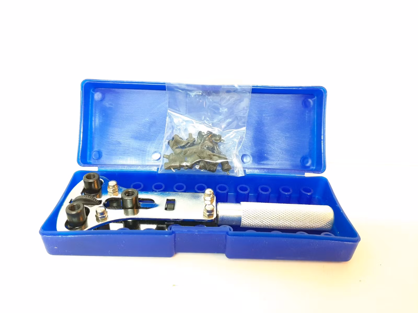 1) En justerbar boettöppnare. Ställ in måttet i denna boettöppnare och använd den för att snurra av boetten på klockan. Måtten som går att ställa in går allt från 16mm till 32mm i diameter för boetter (cirkamått). Den är till för klockor och urverk med gängade boetter. Det medföljer 18 olika munstycken / bits som byts ut beroende på boettens storlek. Munstyckenas storlekar är 3st platta, 3st fyrkantiga, 3st trianglar och 9st runda. Boettöppnaren är gjord av metall. Boettöppnaren kommer i ett plastfodral.