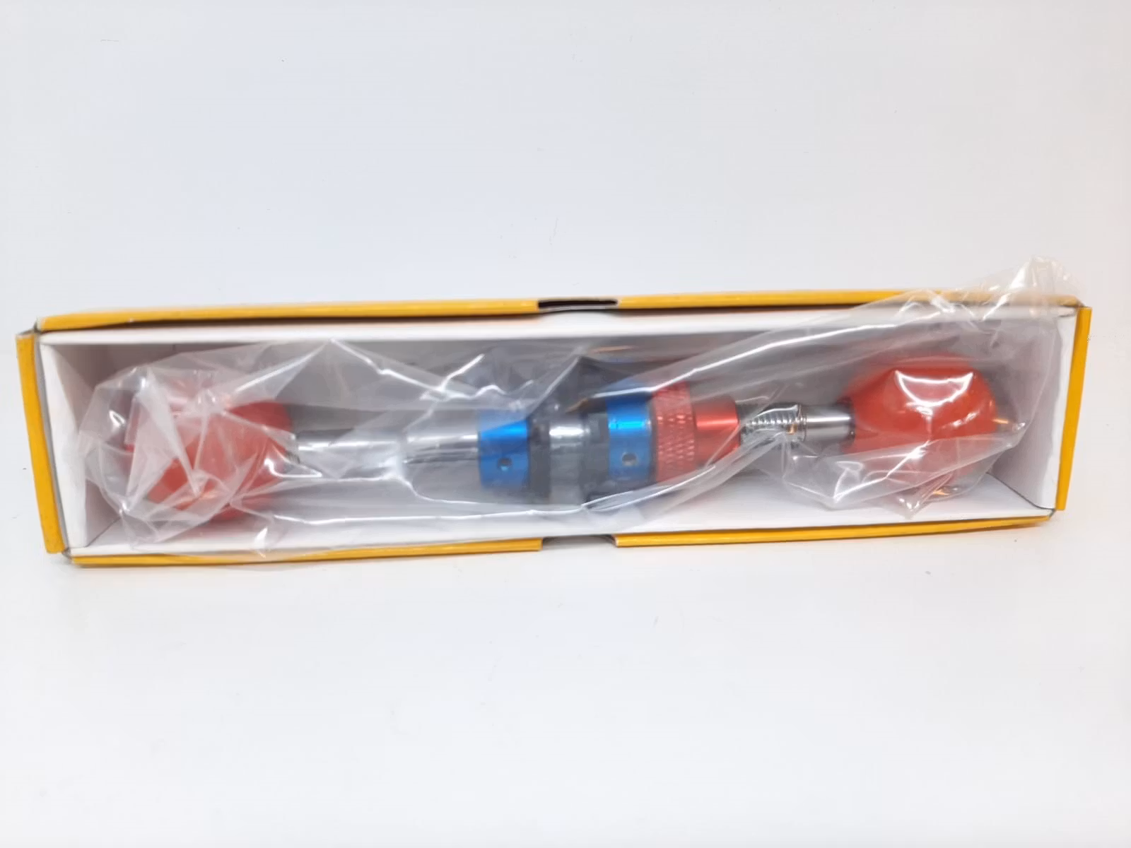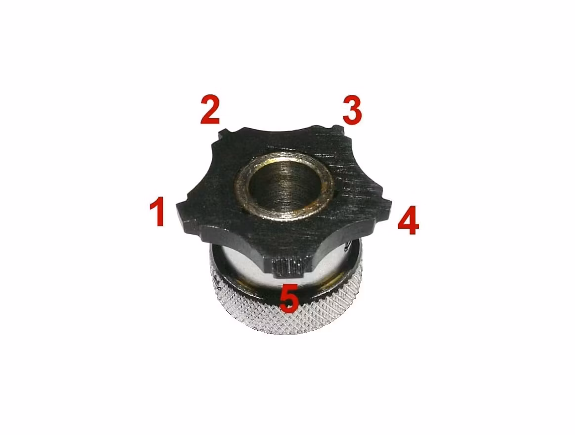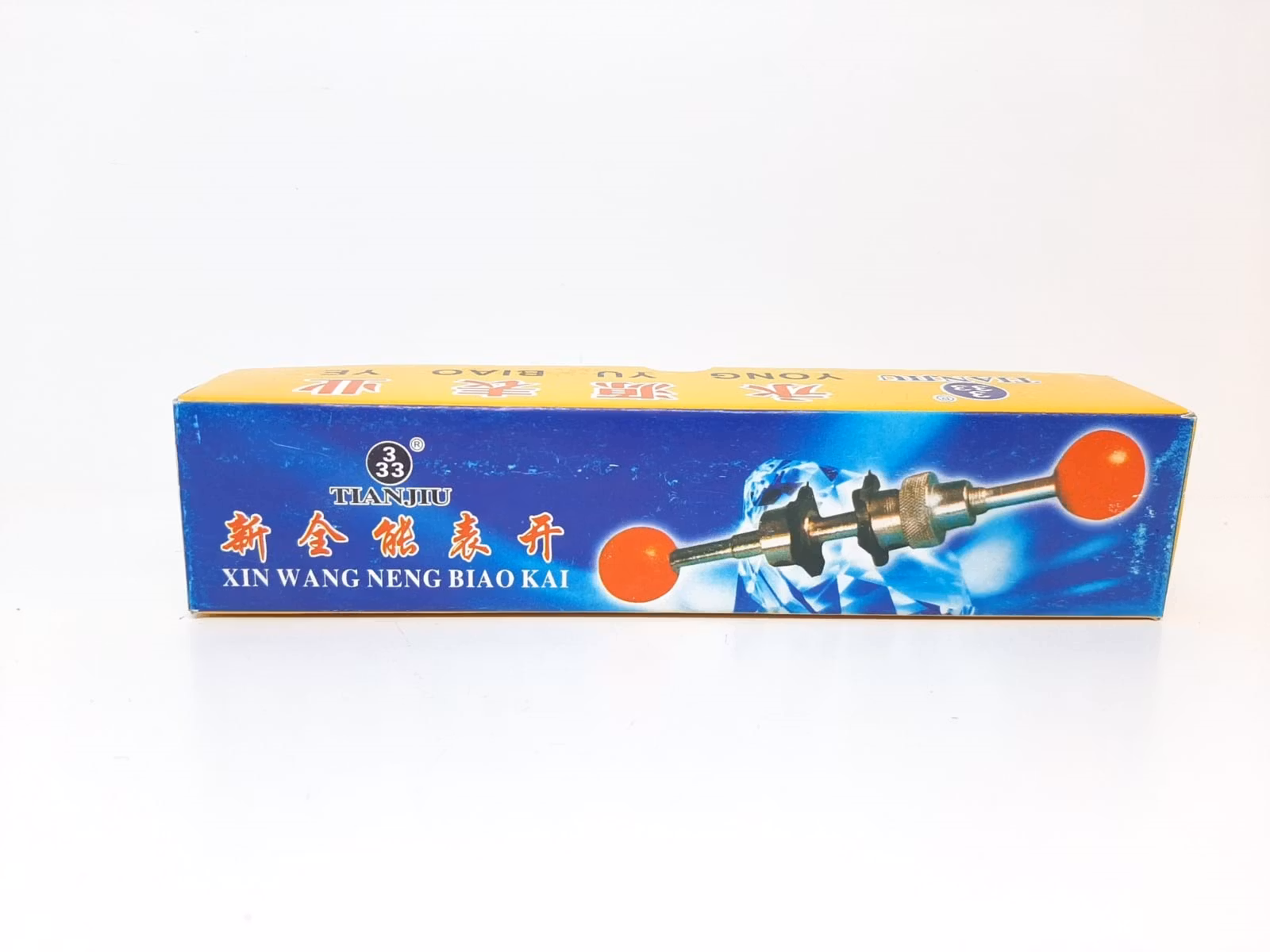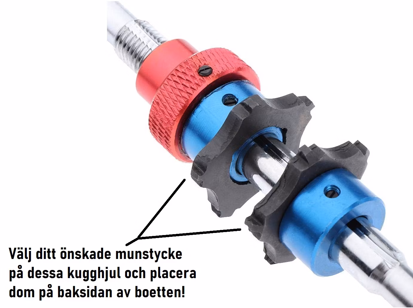 De röda handtagen används för att greppa tag om själva verktyget. I mitten så finns två kugghjul med olika sorters munstycken. Välj det munstycke som passar din boett bäst och skruva ihop de likadana munstyckena på boetten/klockan. Använd sedan handtagen för att sakta och säkert få bort locket på boettens baksida.