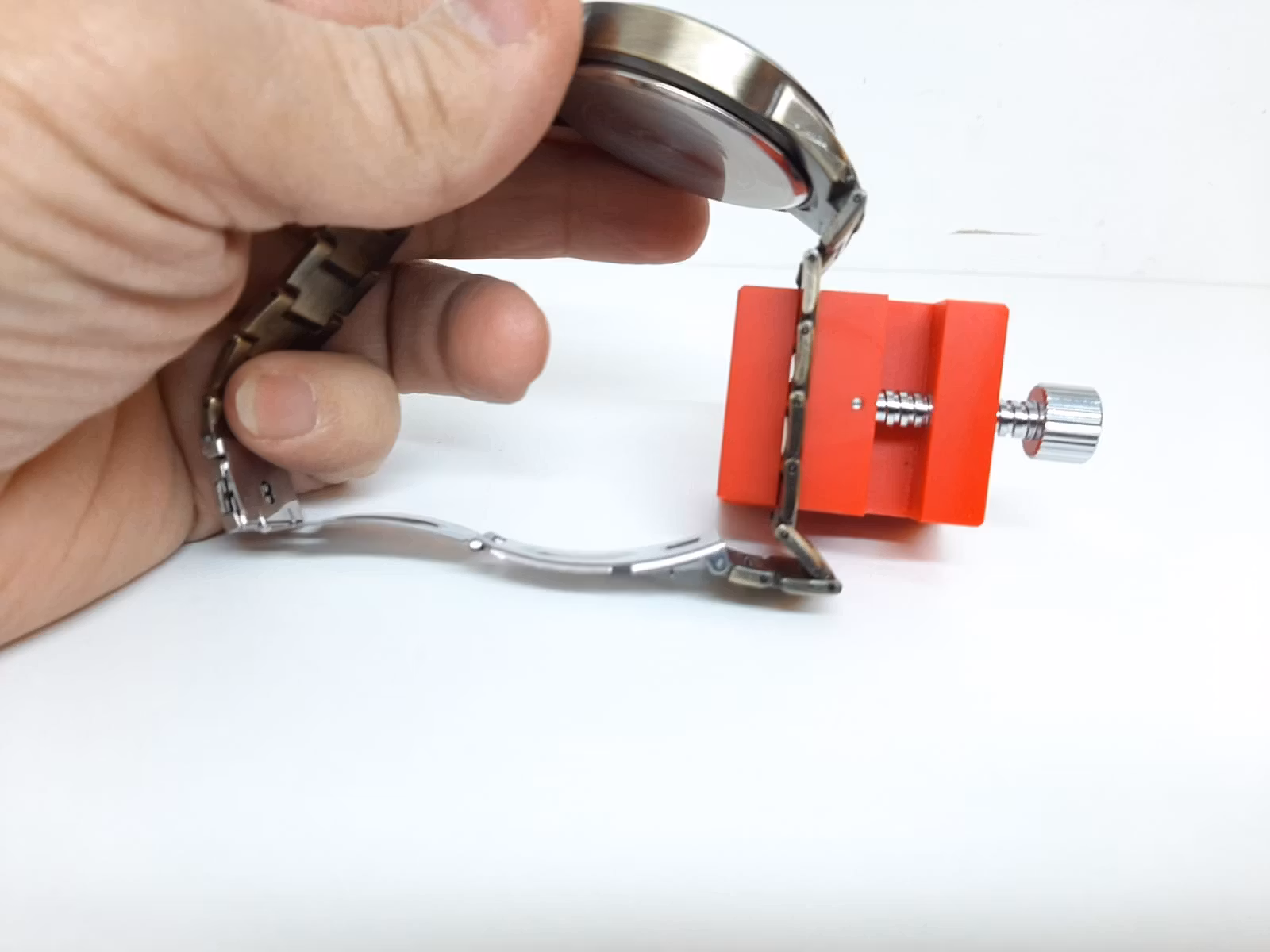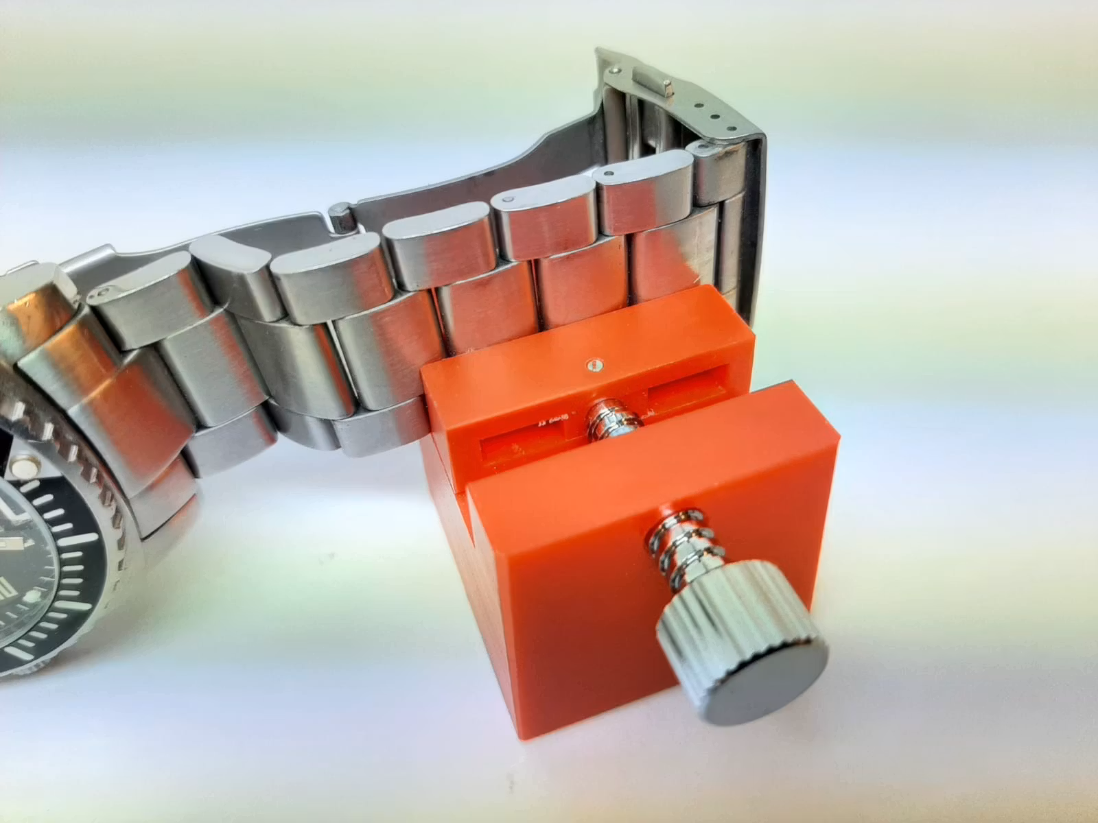Du köper ett verktyg som används för att spänna/hålla fast klockarmband, vilket underlättar vid exempelvis reparationer eller utbyte av länkar. Verktyget skickas i slumpmässig färg.