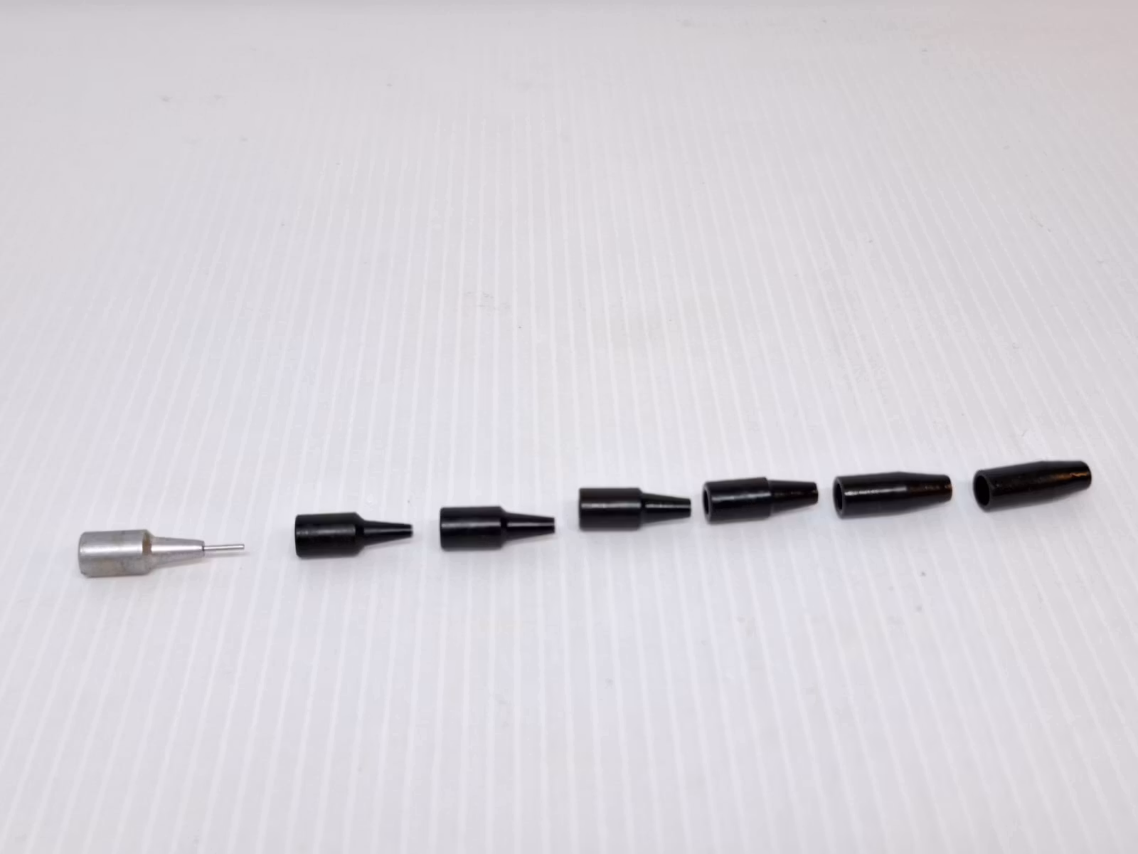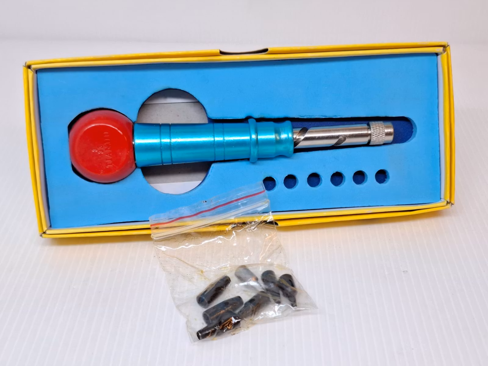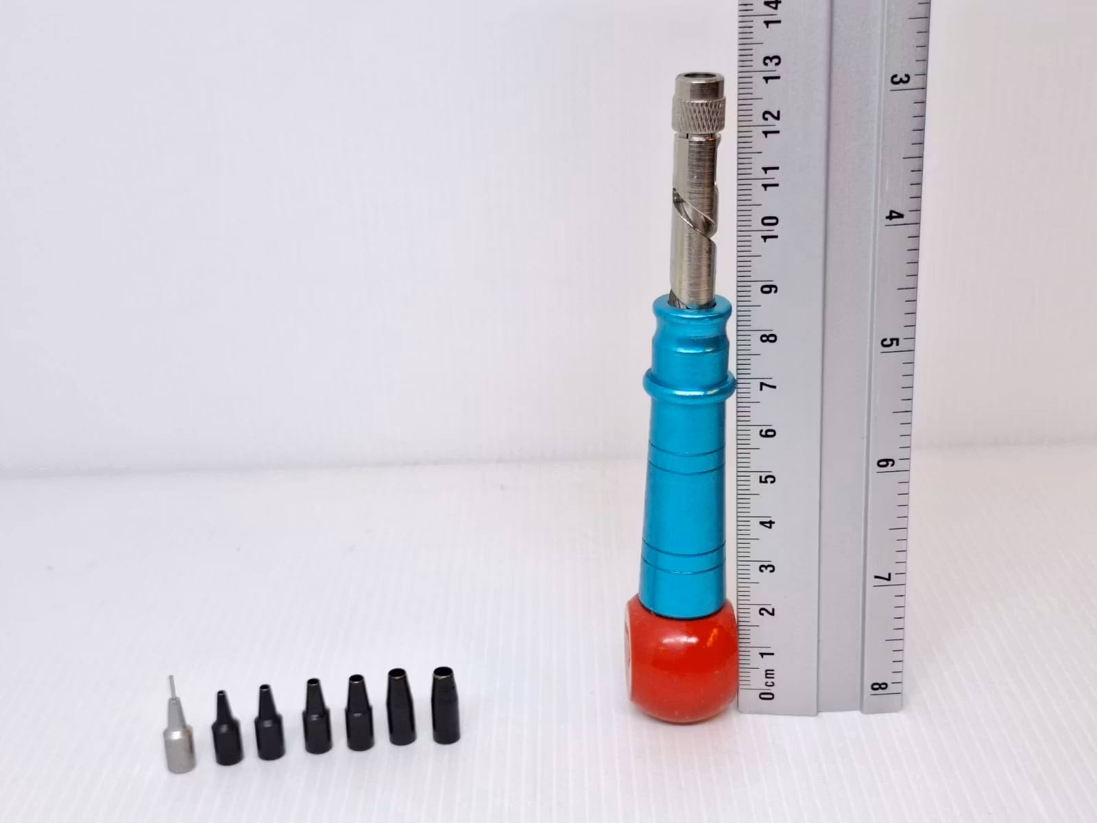 Det medföljer sju munstycken med olika diameterstorlekar. Måtten sträcker sig mellan 1.5 millimeter och upp till 4.0 millimeter. Placera munstycket med önskat mått i håltagaren genom att skruva av skyddet. Placera sedan fast ditt önskade munstycke och skruva tillbaka skyddet. Gör sedan hål i ditt klockarmband genom att placera håltagaren på armbandet och tryck sedan håltagaren mot armbandet (genom att trycka det röda handtaget ner mot armbandet). Produkten kommer i sin förpackning.