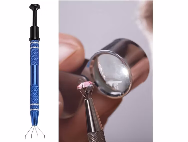 Du köper ett verktyg som används för att greppa tag om små föremål, exempelvis klockdelar, diamanter, med mera. Verktyget, som också kan kallas för diamanthållare, plockningsverktyg och pincett, har fyra klor som kommer fram när man trycker på den svarta knappen längst back på verktyget. Dessa klor är designade att kunna greppa tag om olika föremål, oavsett skepnad (runda, rektangulära, oregelbundna).