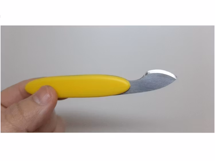 3) En boettöppnare som påminner om en skalpell. Handtaget är i gul färg (plast) medans bladet är av rostfritt stål.