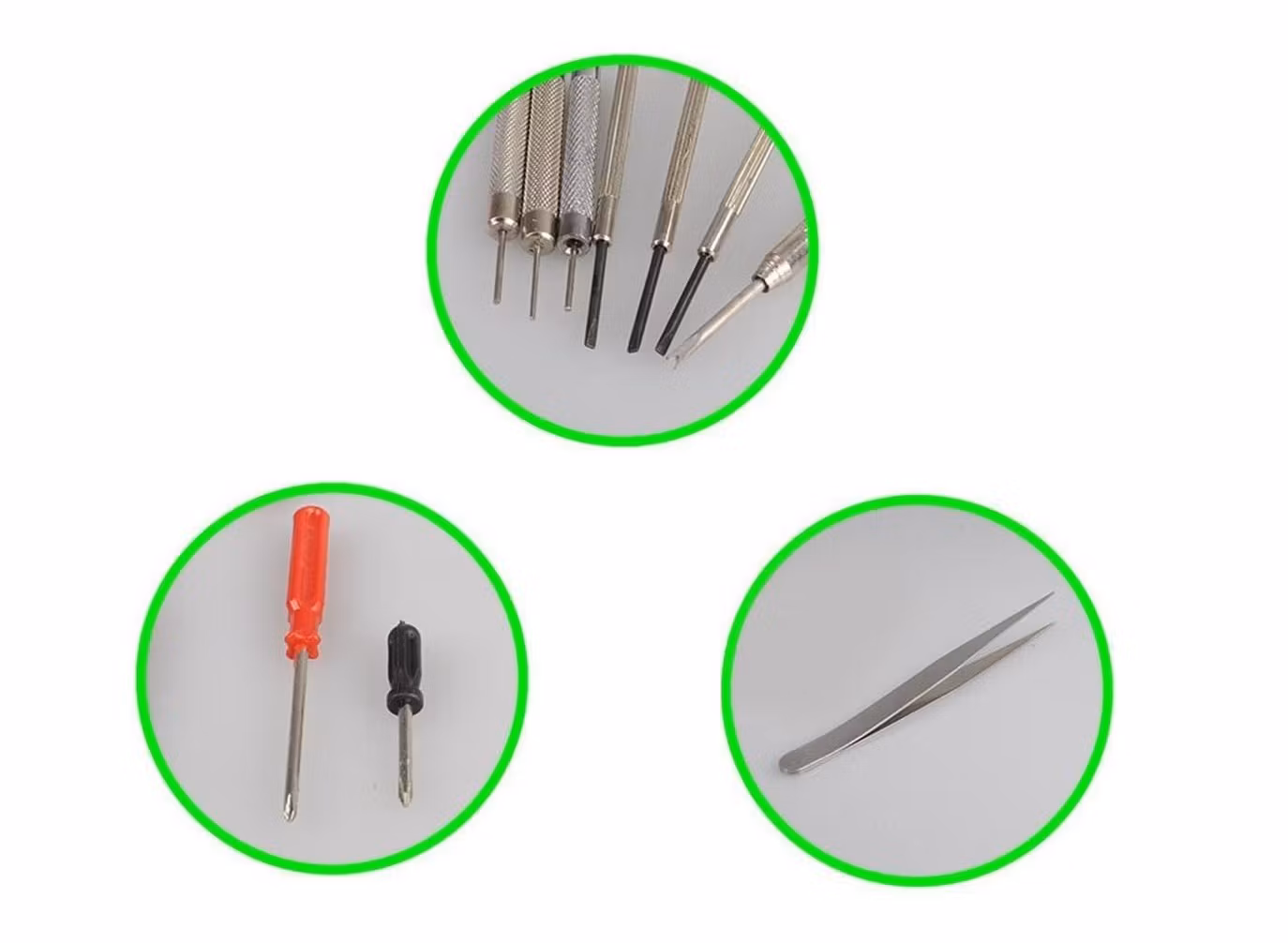 Du köper ett set som innehåller 16 stycken verktyg som är praktiska att använda för reparation och underhåll av klockor och urmakeri. Det medföljer även två klockarmband (ett svart och ett brunt).