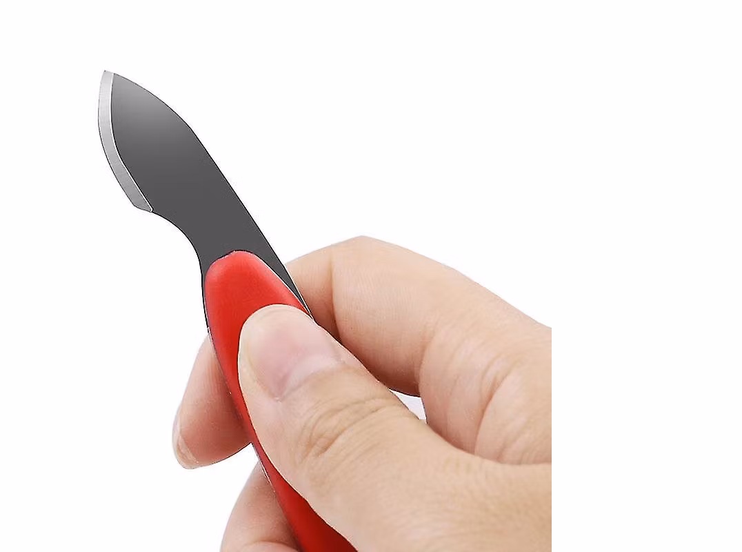 5) En boettöppnare som påminner om en kniv / skalpell. Handtaget är i röd färg (plast) medans bladet är av rostfritt stål.
