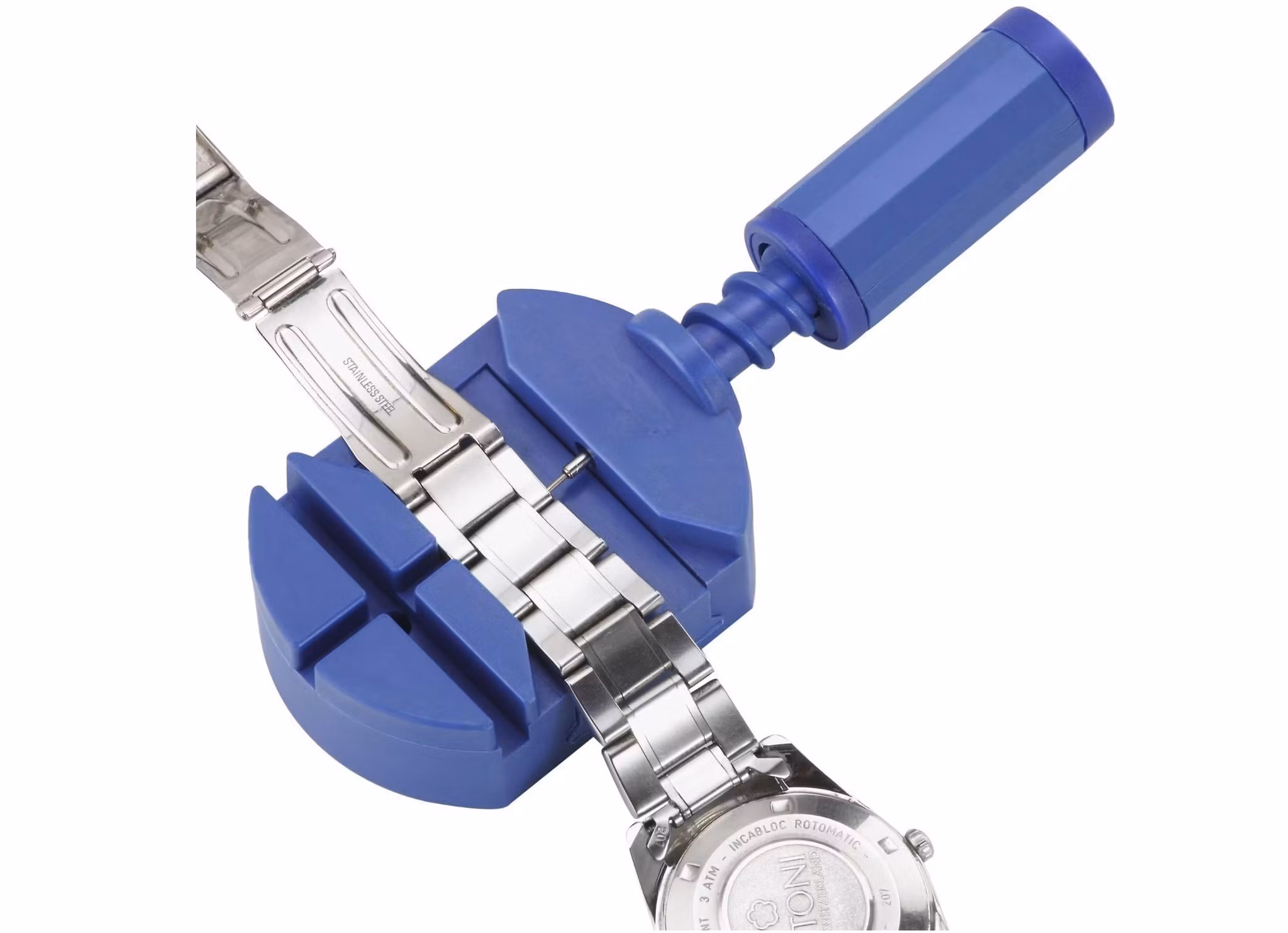 1) En Länkborttagare som kommer i blå färg. Placera klockan på borttagaren och använd nålen för att ta bort bandstiften från klockarmbandet.