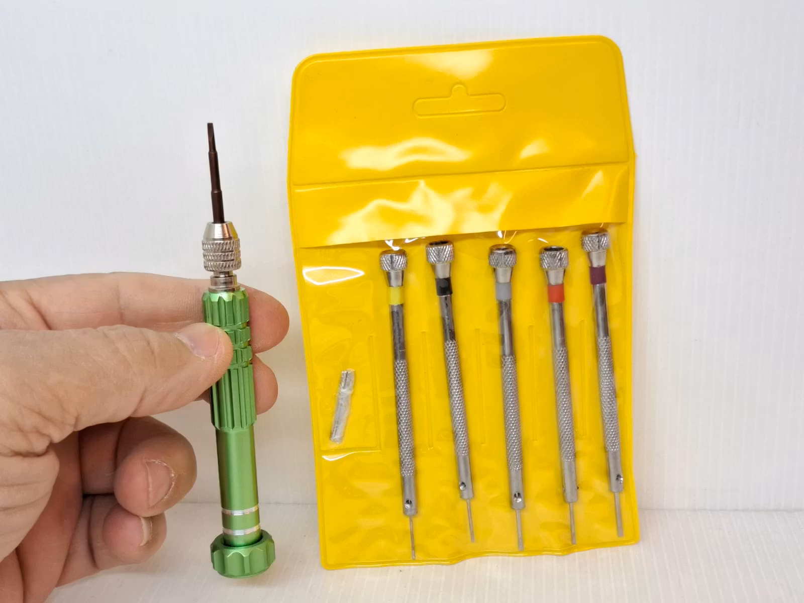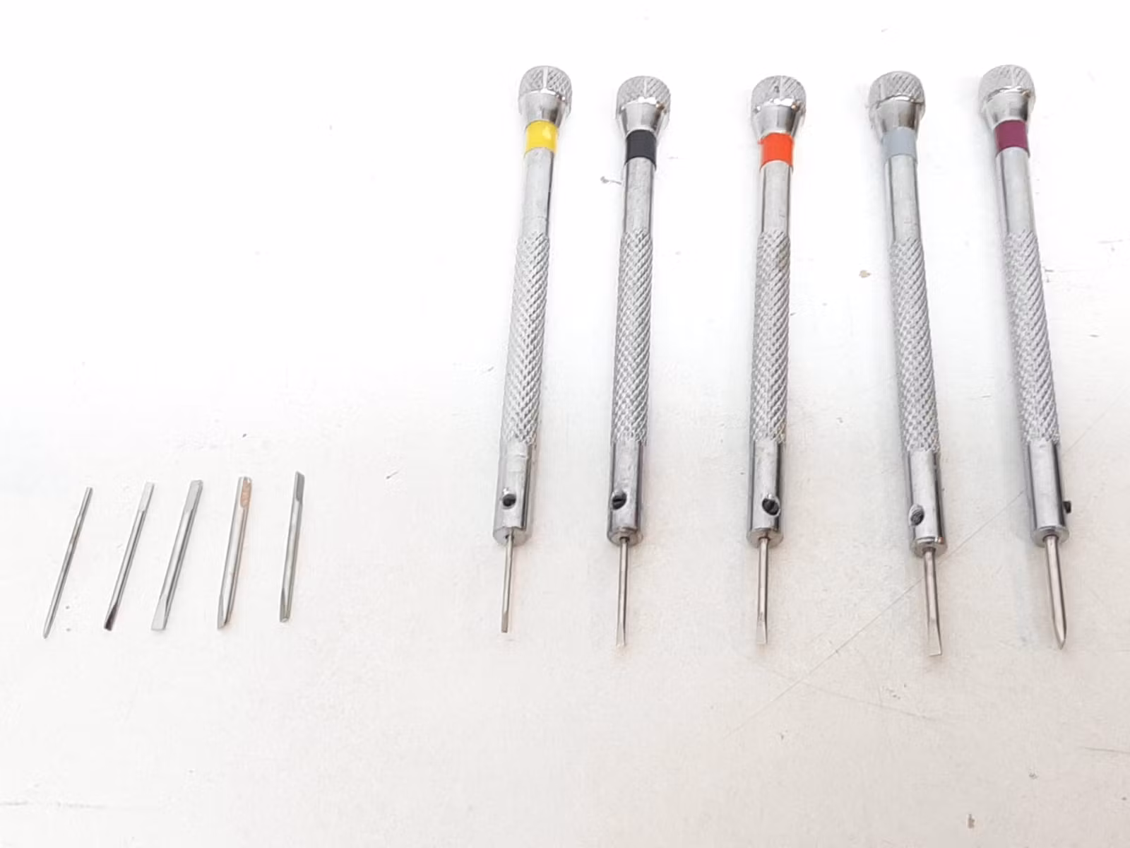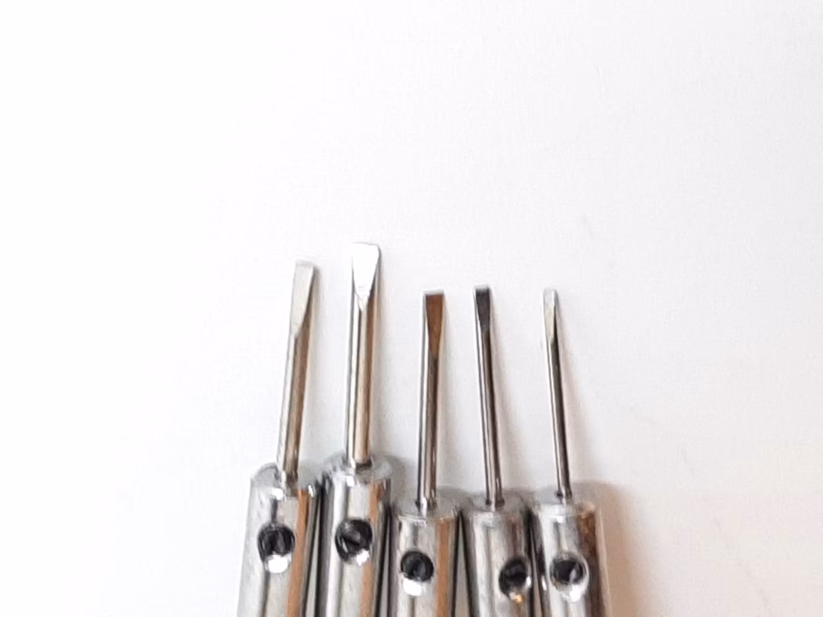 1) Ett set som innehåller fem skruvmejslar (spårmejslar) med följande mått: 0.8 mm, 1.0 mm, 1.2 mm, 1.4 mm och 1.6 mm.