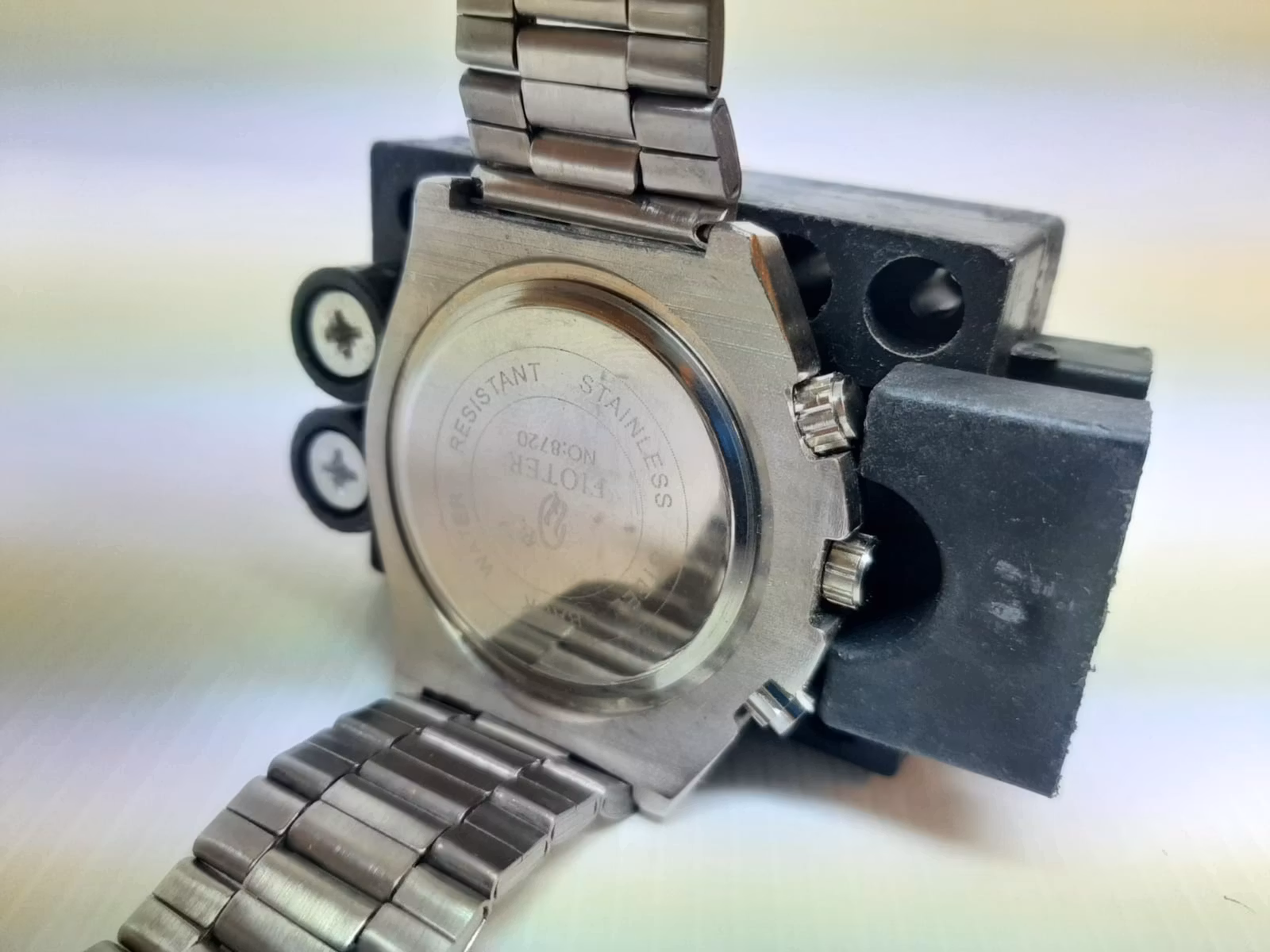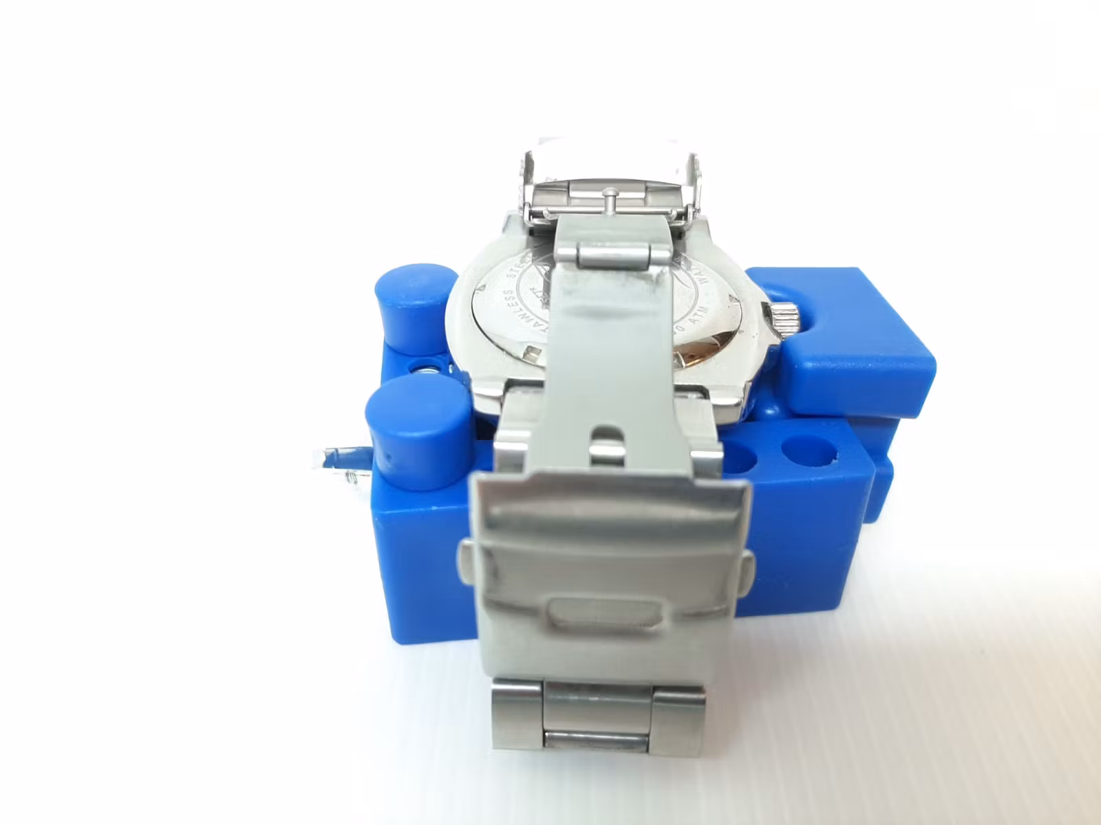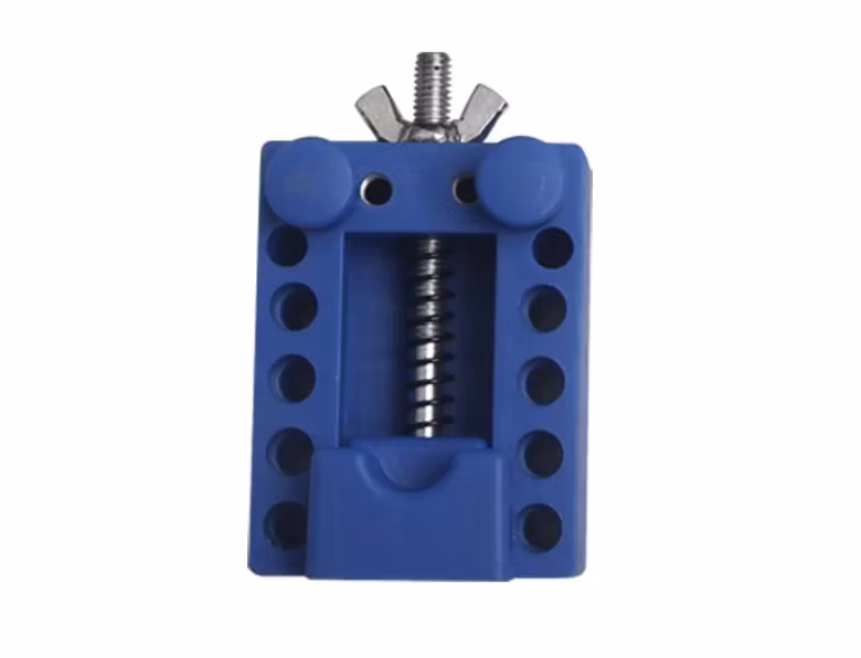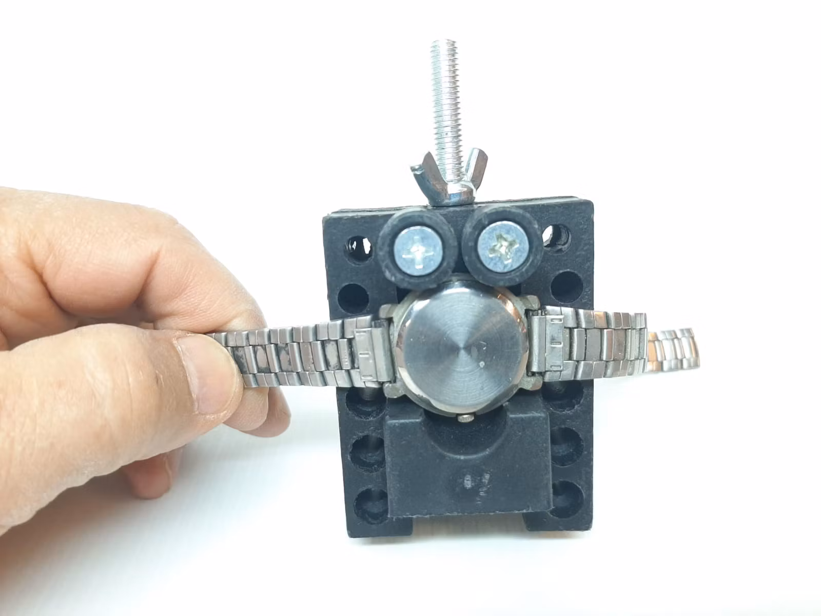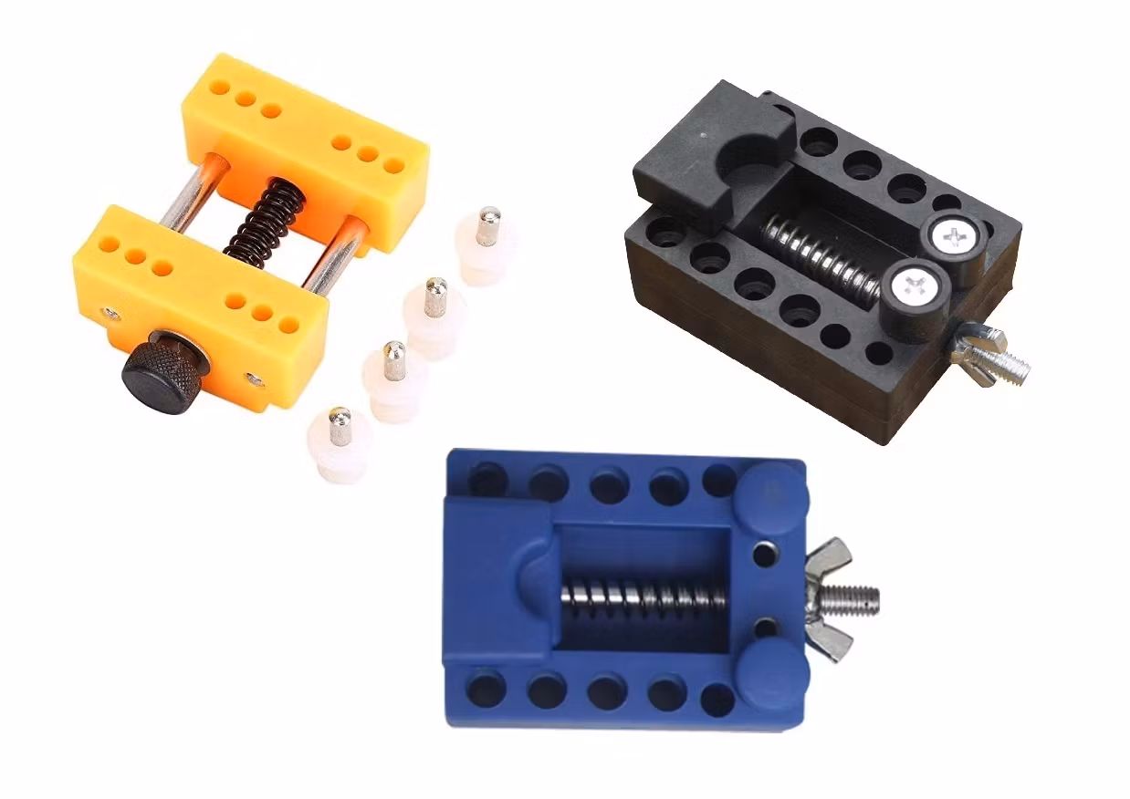 Du köper ett skruvstäd / klockhållare till klocka. Placera din klocka på klockhållaren för att hantera klockan säkert och smidigt när du exempelvis reparerar den, ska öppna boetten, med mera. Med sina plaststift så repas inte klockorna. Skruvstädet har som maxmått för boetter upp till ca 40 mm.