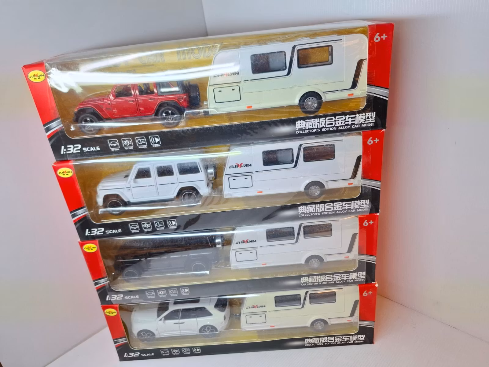 Du köper en modellbil med husvagn. Skala är 1:32. Bilarna kommer i olika färger, se bilderna.