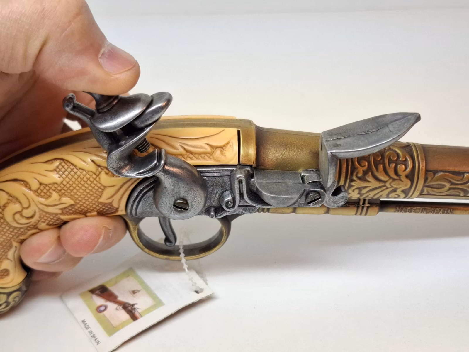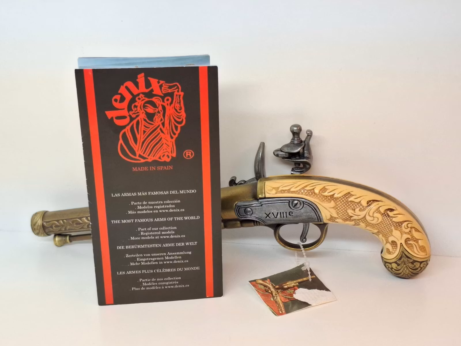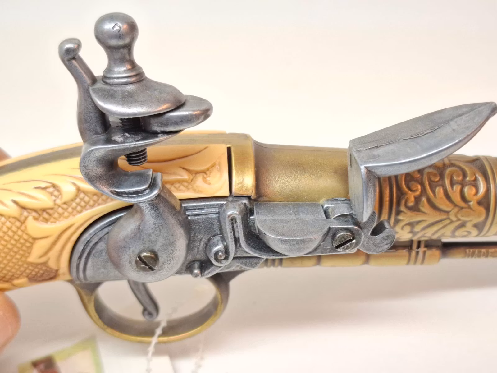 Du köper en replika av en belgisk flintlås pistol med en design från 1700-talet. Denna replika passar perfekt för samlare och historieentusiaster. Mekaniken hos denna flintlåspistolen är fungerande men har inga verkliga funktioner, utan fungerar som prydnad. Denna replika är tillverkad av det spanska replika-företaget Denix. Replikan kommer i en förpackning och med broschyr.