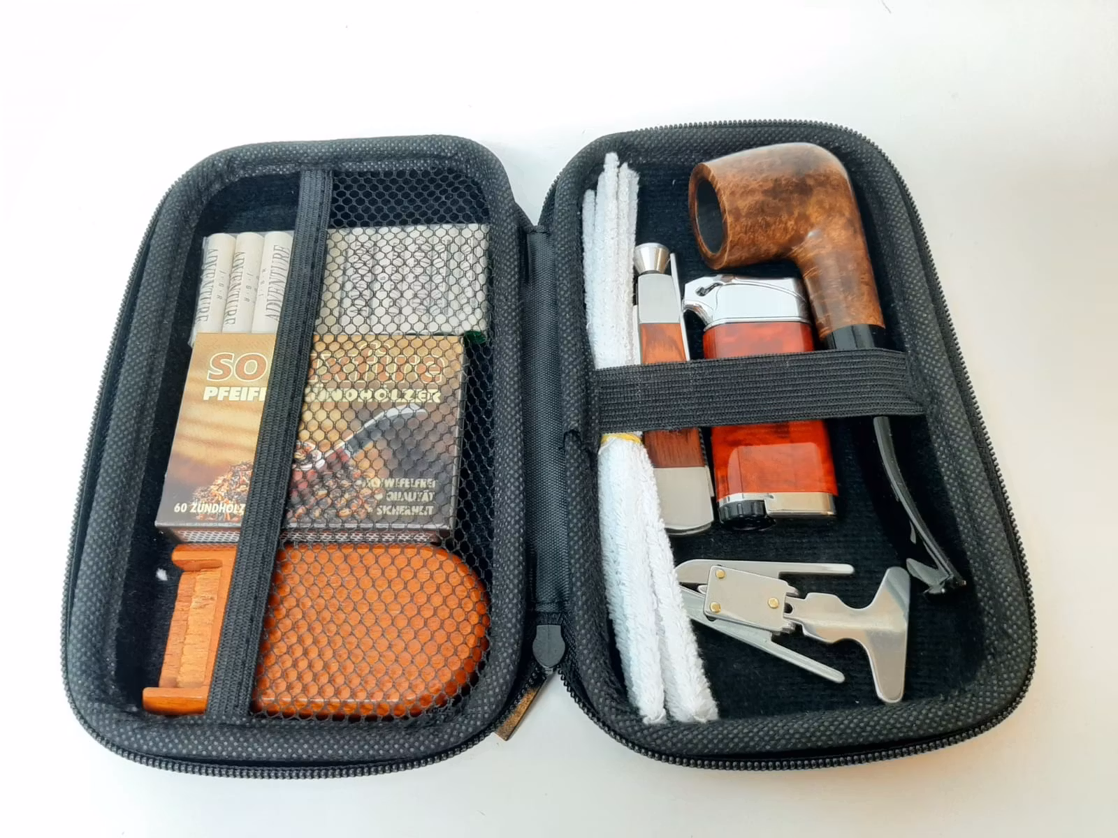 8) En pipväska där du kan förvara pipan och tillbehör. Väskans yttre är tillverkad av hård plastlegering men har en mjuk insida. Den är ca 20 cm lång, ca 8 cm bred och ca 5 cm tjock.