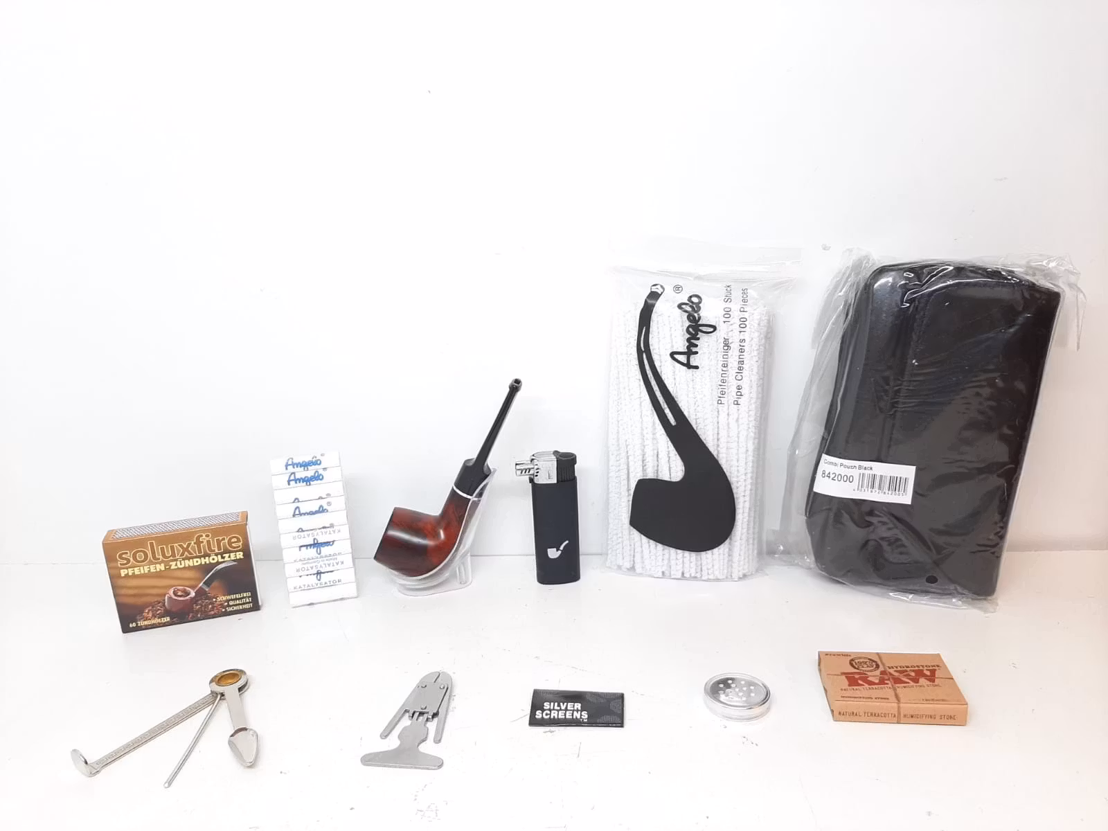 1) En pipväska av märket Angelo, med plats för pipa och dess tillbehör. Pipväskan är tillverkad av syntetiskt läder och har också ett fack där man kan förvara sin tobak.