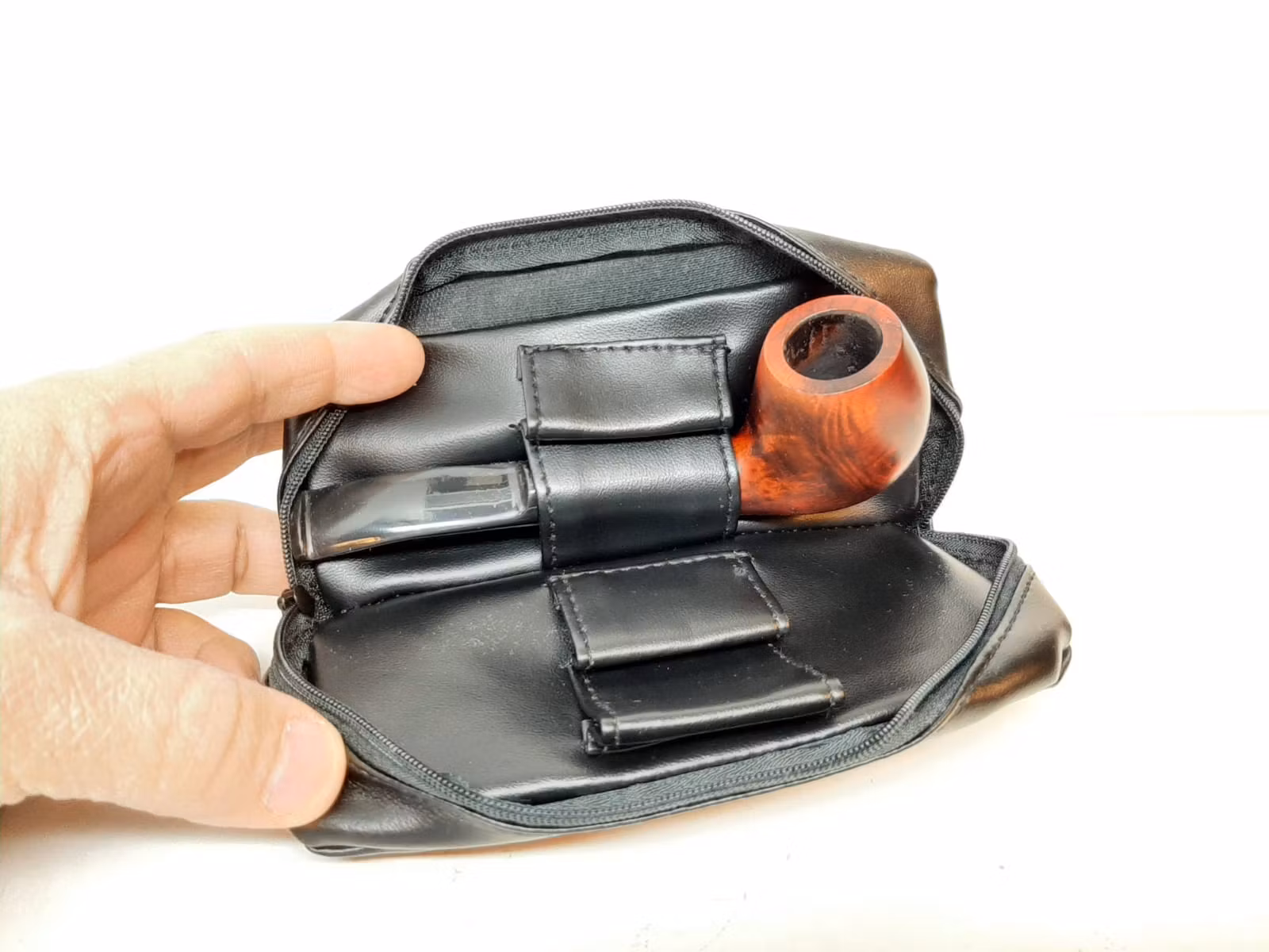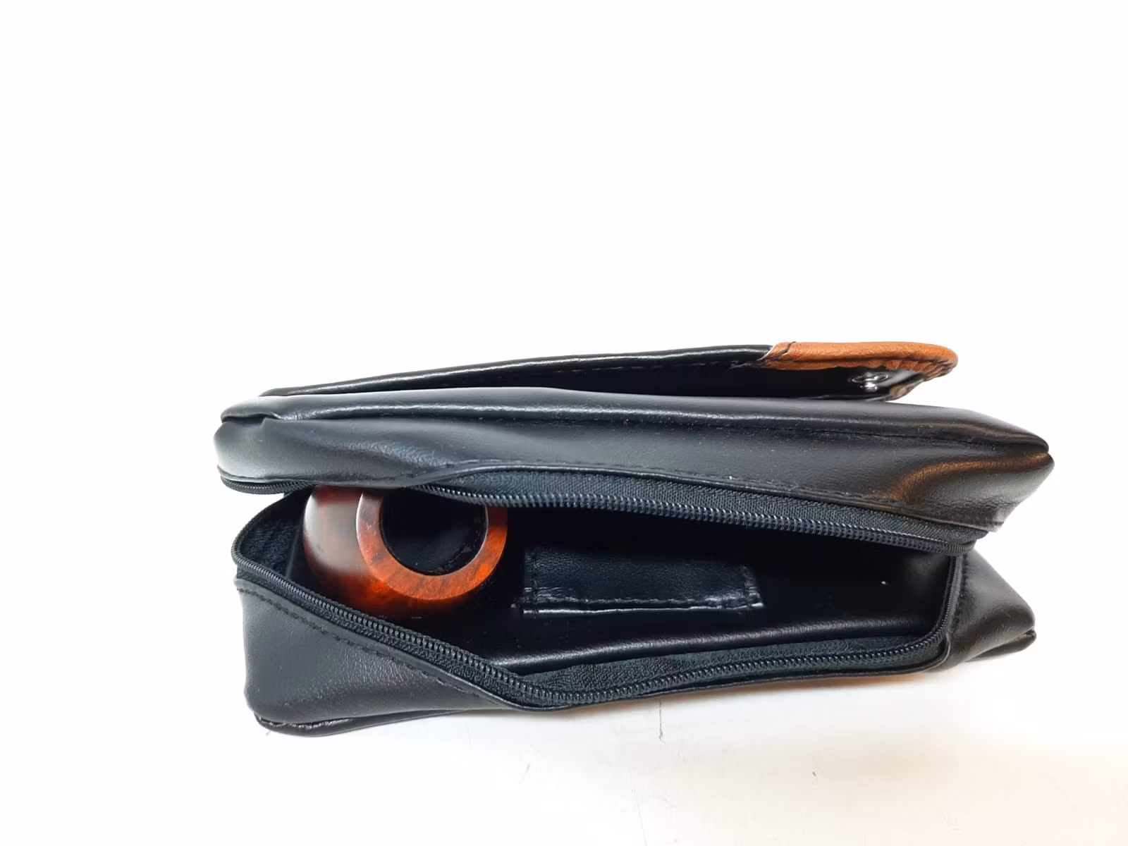 1) En pipväska av märket Angelo, med plats för två pipor och piptillbehör. Pipväskan är tillverkad av syntetiskt läder och har också ett fack där man kan förvara sin tobak.