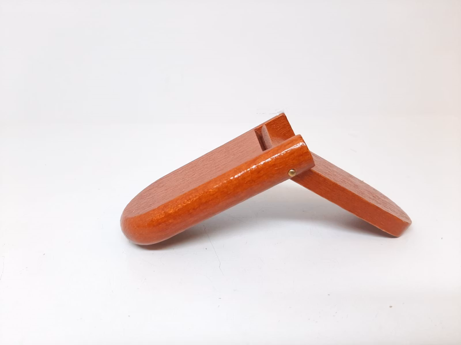 3) Ett pipställ i trä som går att fälla ihop. På insidan av pipstället finns svart lentyg.
