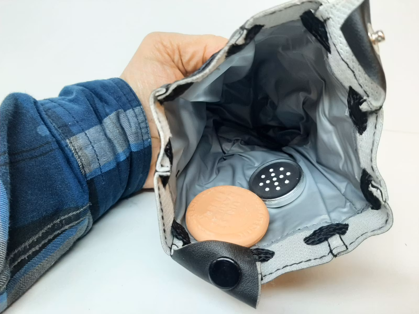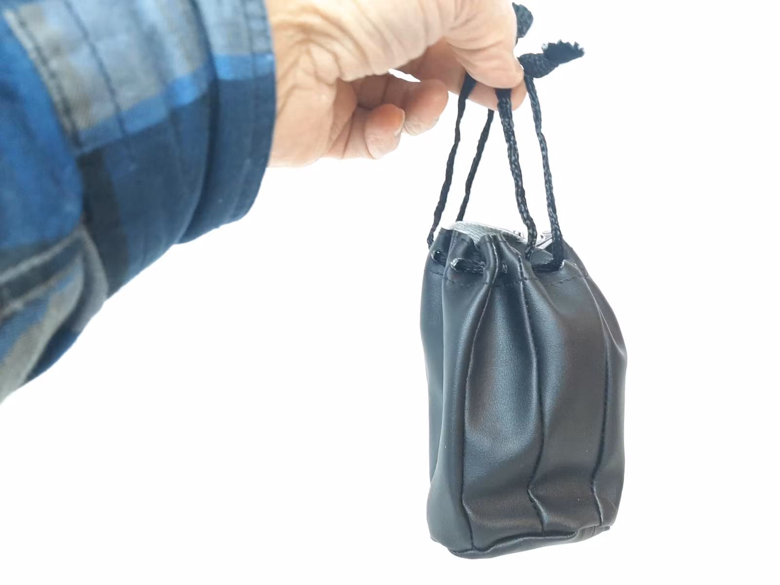 8) En väska / tobakspung för förvaring av tobak (tillverkad av syntetiskt läder med skyddande plast på insidan)