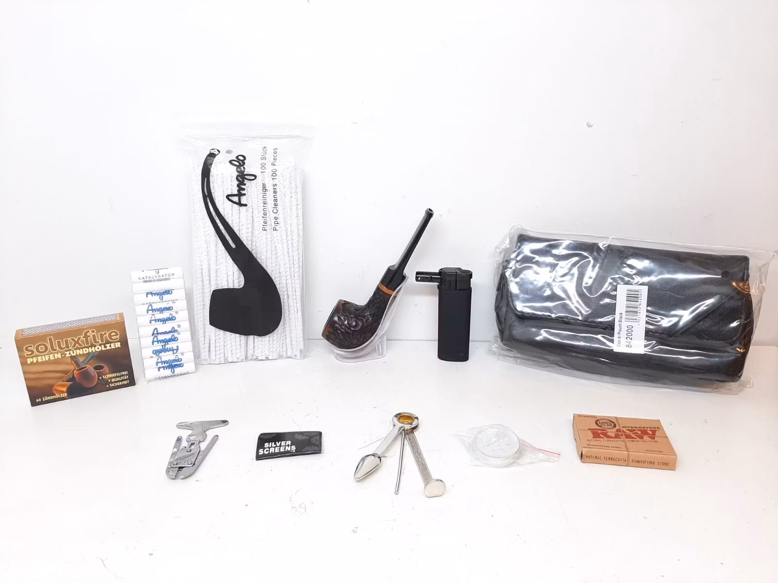 1) En pipväska av märket Angelo, som har plats för pipa och dess tillbehör. Pipväskan är tillverkad av syntetiskt läder och har också ett fack där man kan förvara sin tobak.