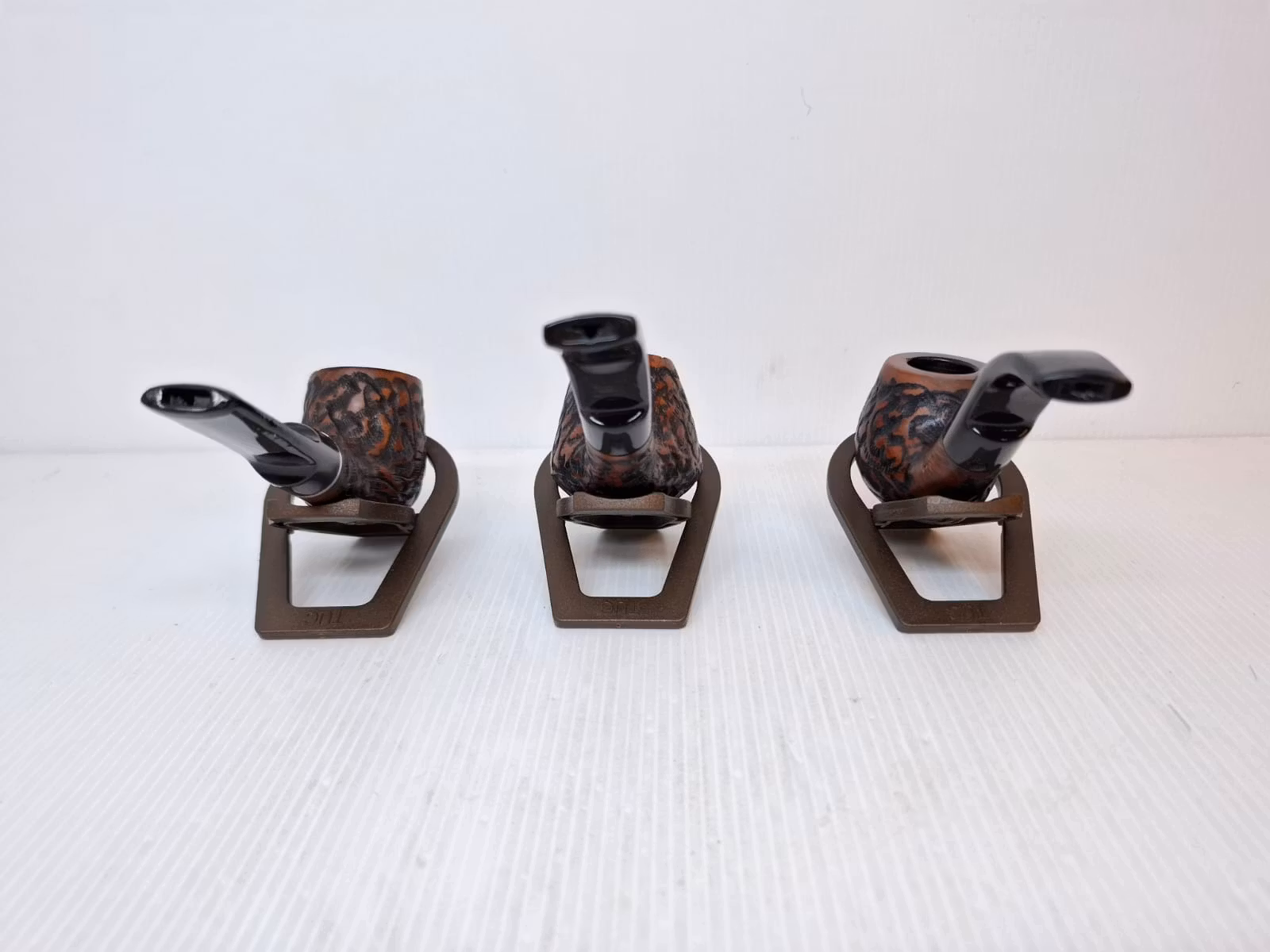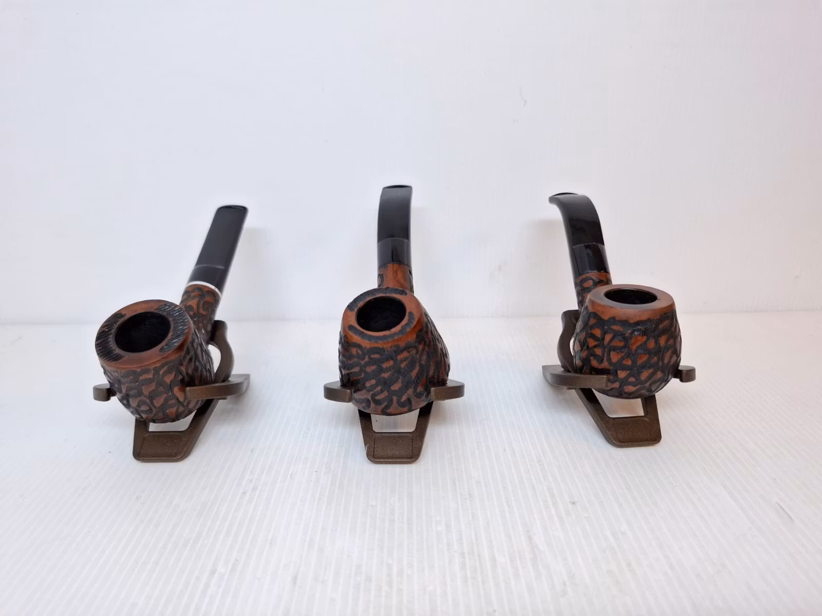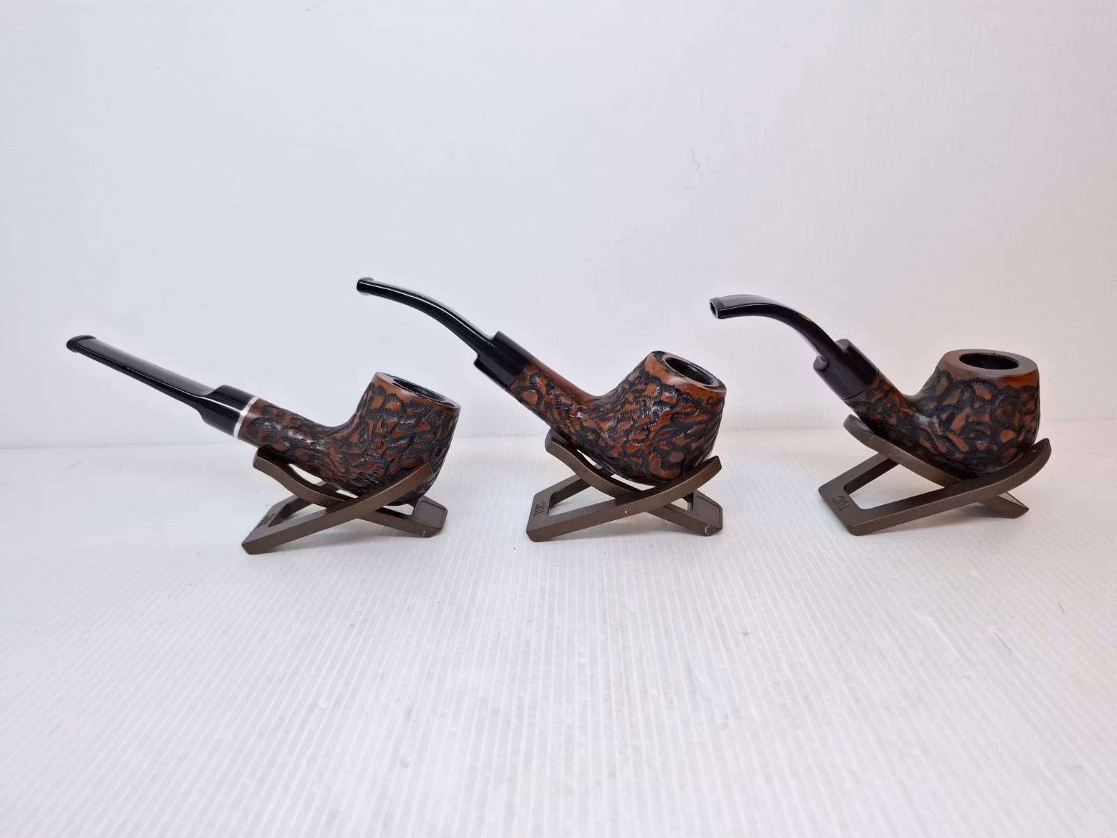 Du köper tre stycken pipor (en rak, en halvböjd och en böjd) av märket Angelo som är tillverkade inom EU. Piporna är gjorda av äkta briarträ. På varje pipa finns texten "ANGELO" inristat. Man kan ha pipfilter i dessa pipor (9mm).
