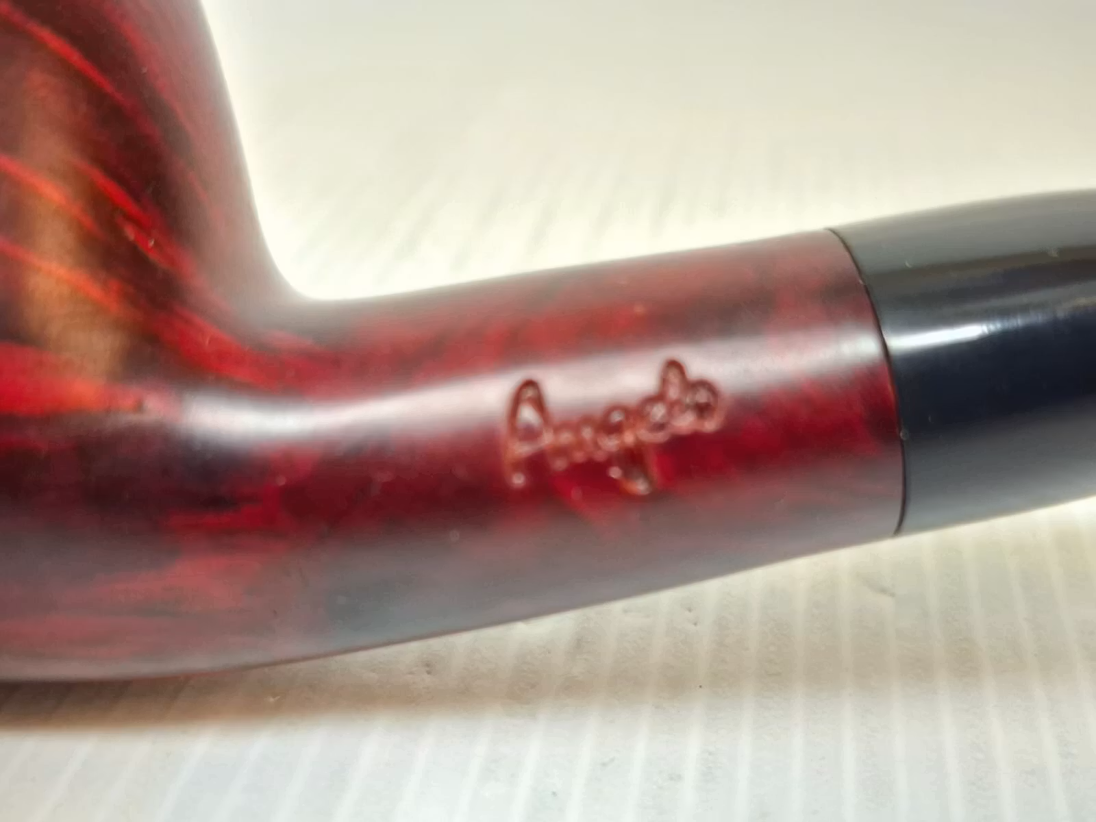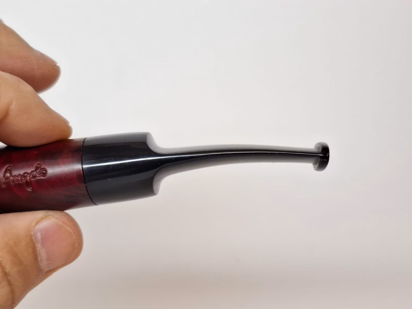 Du köper en pipa av märket Angelo. Pipan är tillverkad inom EU och är gjord av äkta briarträ. Det tjocka och platta munstycket (se bilderna) ger pipan dess unika utseende. Vid sidan av pipan finns texten "ANGELO" inristat. Man kan ha 9mm pipfilter i denna pipa. Pipan kommer i en exklusiv ask från Angelo.