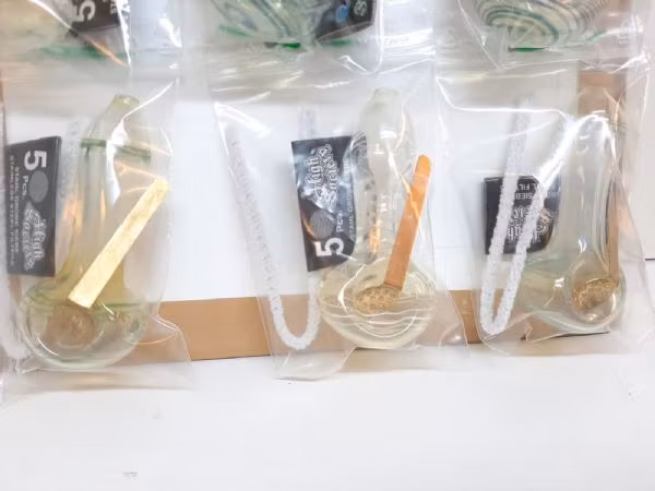 Du köper en Display innehållande 9 stycken glaspipor. Varje glas pipa kommer i en liten påse med följande innehåll: