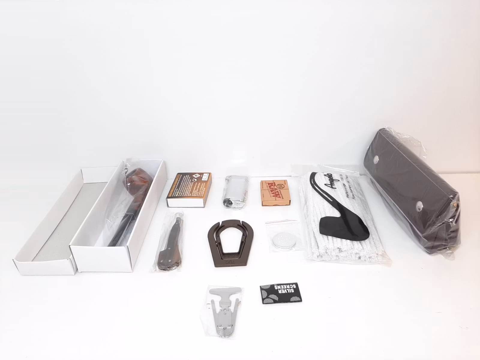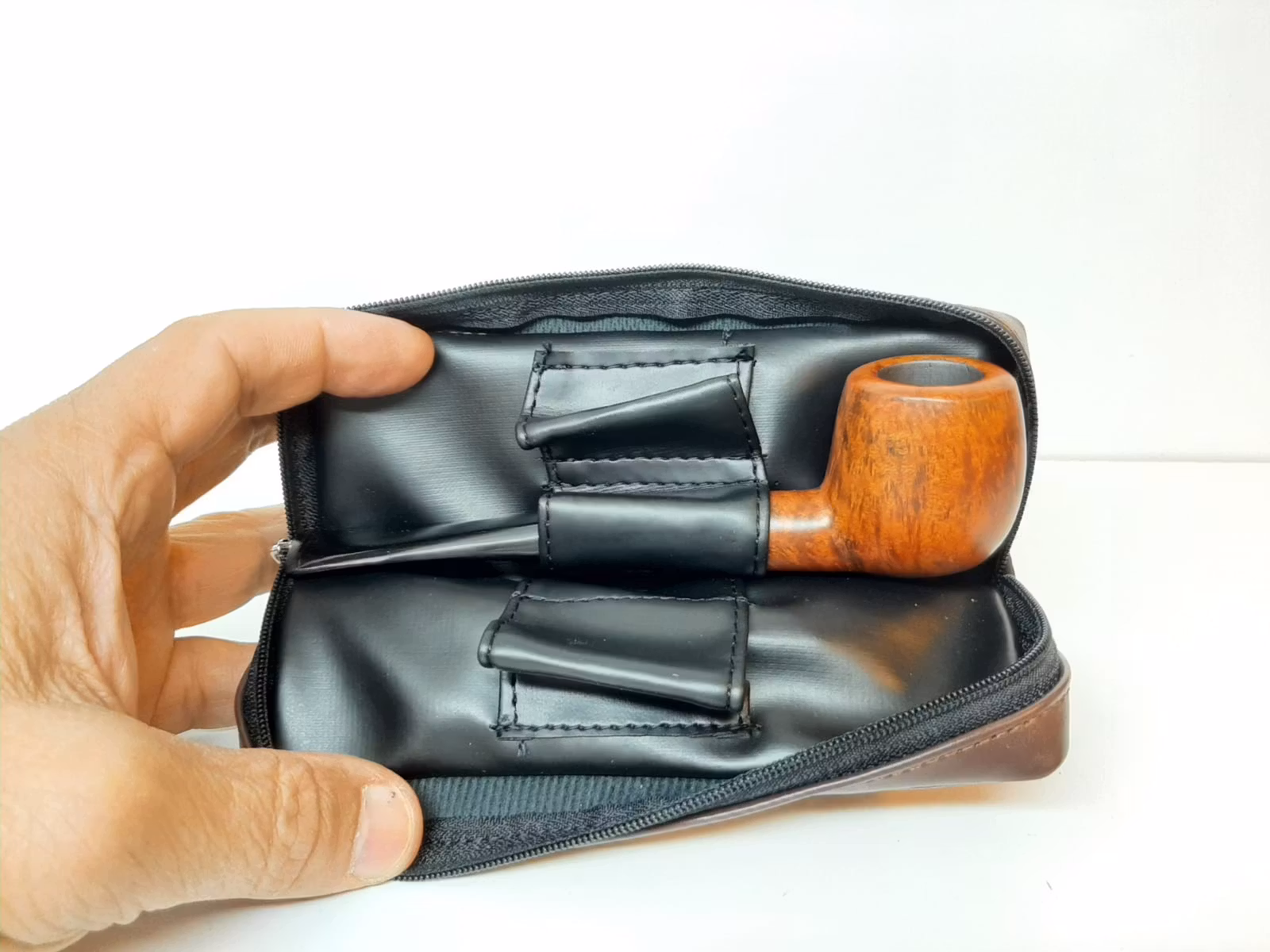 2) En Pipväska (tillverkad av syntetiskt läder). Du kan förvara din pipa, piptillbehör och annat i denna praktiska pipväska. Den är ca 16 cm lång, 10 cm hög och ca 3 cm tjock.
