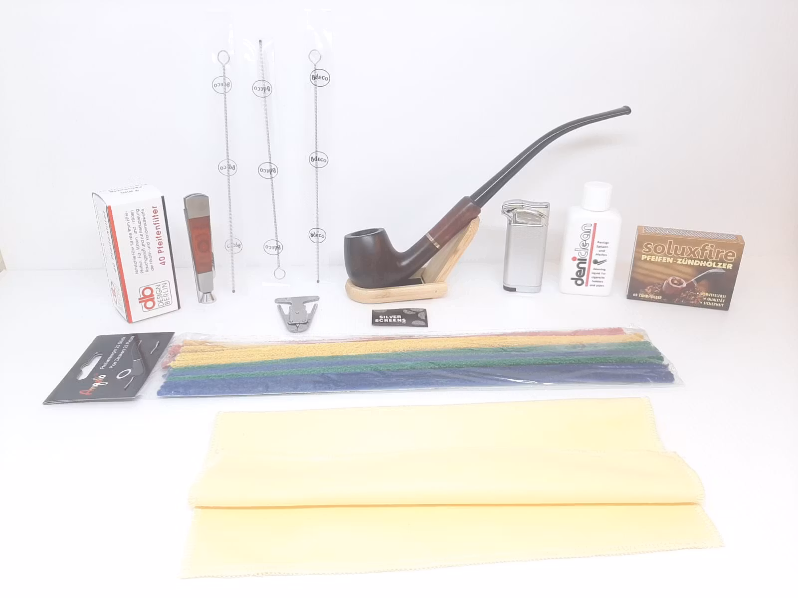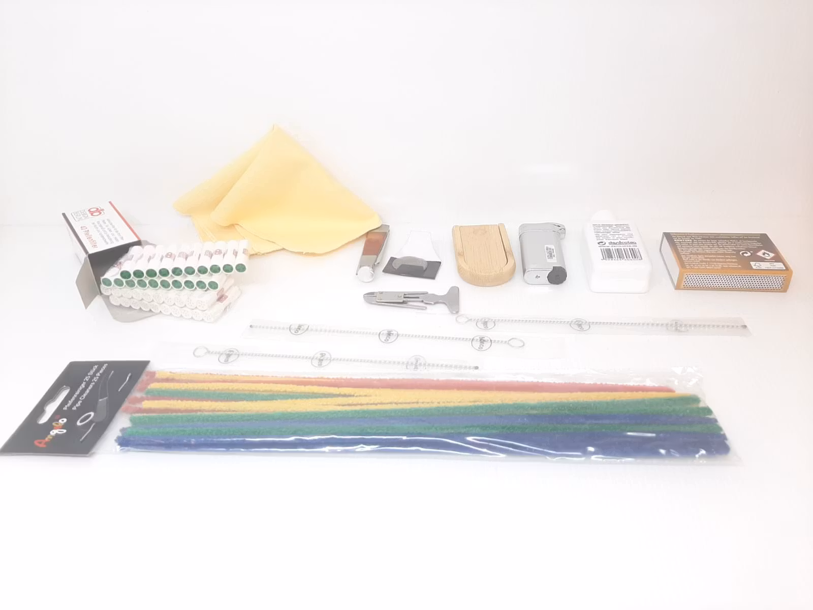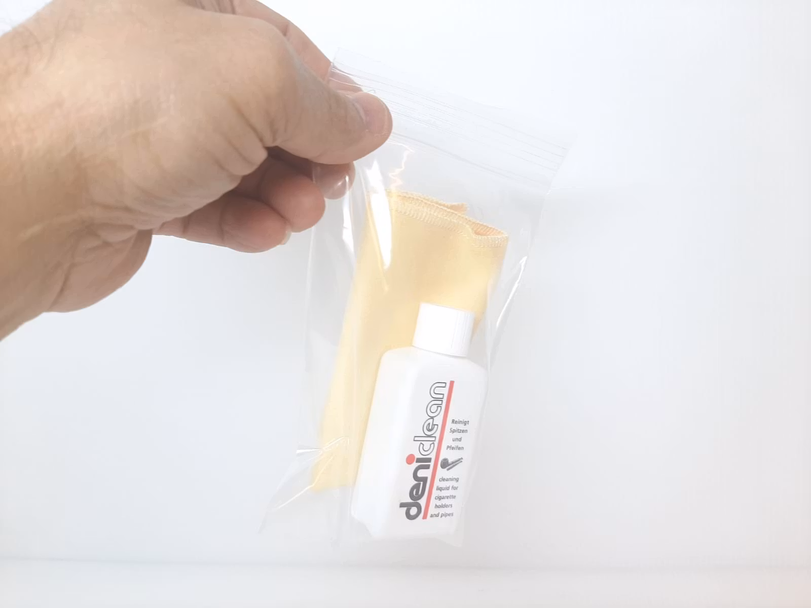 10) En flaska Deniclean rengöringsvätska (50 ml). Flaskan innehåller vätska för rengöring av pipa och pipmunstycke. Doppa försiktigt in en piprensare i flaskan så den blir blöt och använd den blöta piprensaren och/eller piphuvudet för att göra rent.