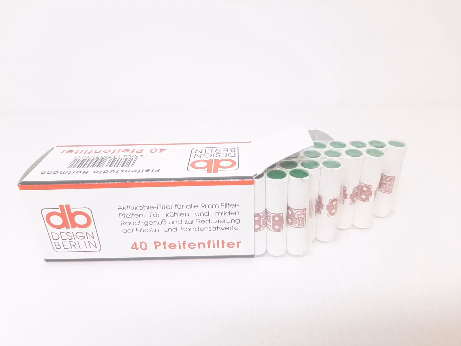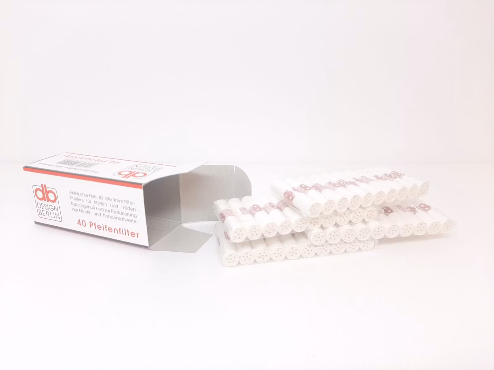 9) En förpackning med 40st pipfilter (9 mm) av det tyska märket db-Berlin: Dessa är tillverkade i Tyskland och innehåller aktivt kol