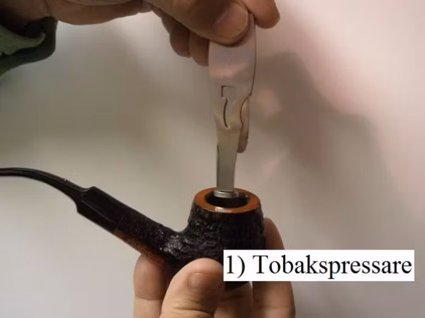 1) Tobakspressaren --> Används för att försiktigt kunna pressa ner tobaken i koppen medans man röker. Detta är viktigt för att kunna hålla en jämn och stabil rökning. Är tobaken inte riktigt komprimerad så kan pipan slockna och då får man börja om.