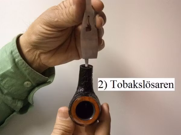 2) Tobakslösaren (eller pekaren) --> Skulle man ha råkat packa tobaken alltför hårt med tobakspressaren så tar man till tobakslösaren och rör om tobaken i pipkoppen för att kunna lösa upp tobaken lite grann. Tobak som är för packad / komprimerad leder till att man inte kan suga in luft genom pipmunstycket och pipan slocknar (på grund av brist på luft). Pekaren är spetsigt och vass.