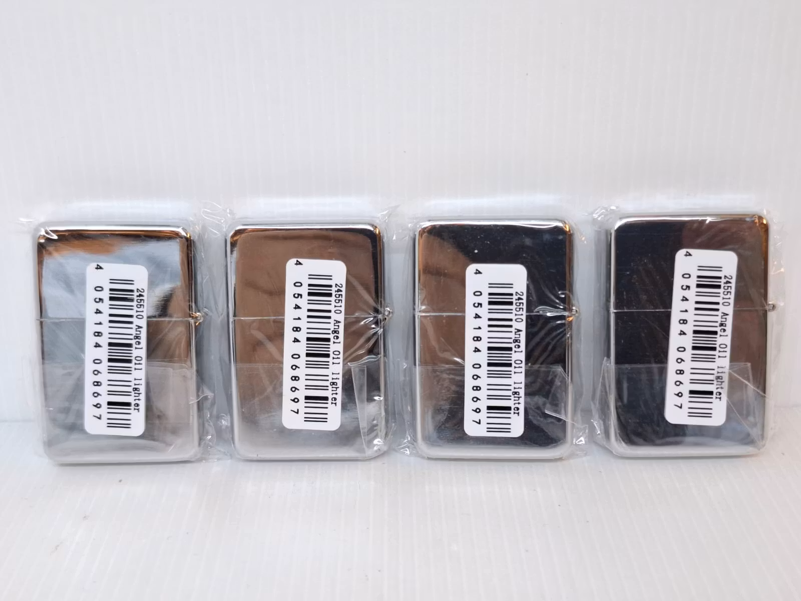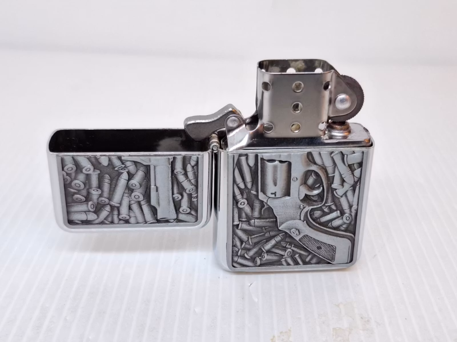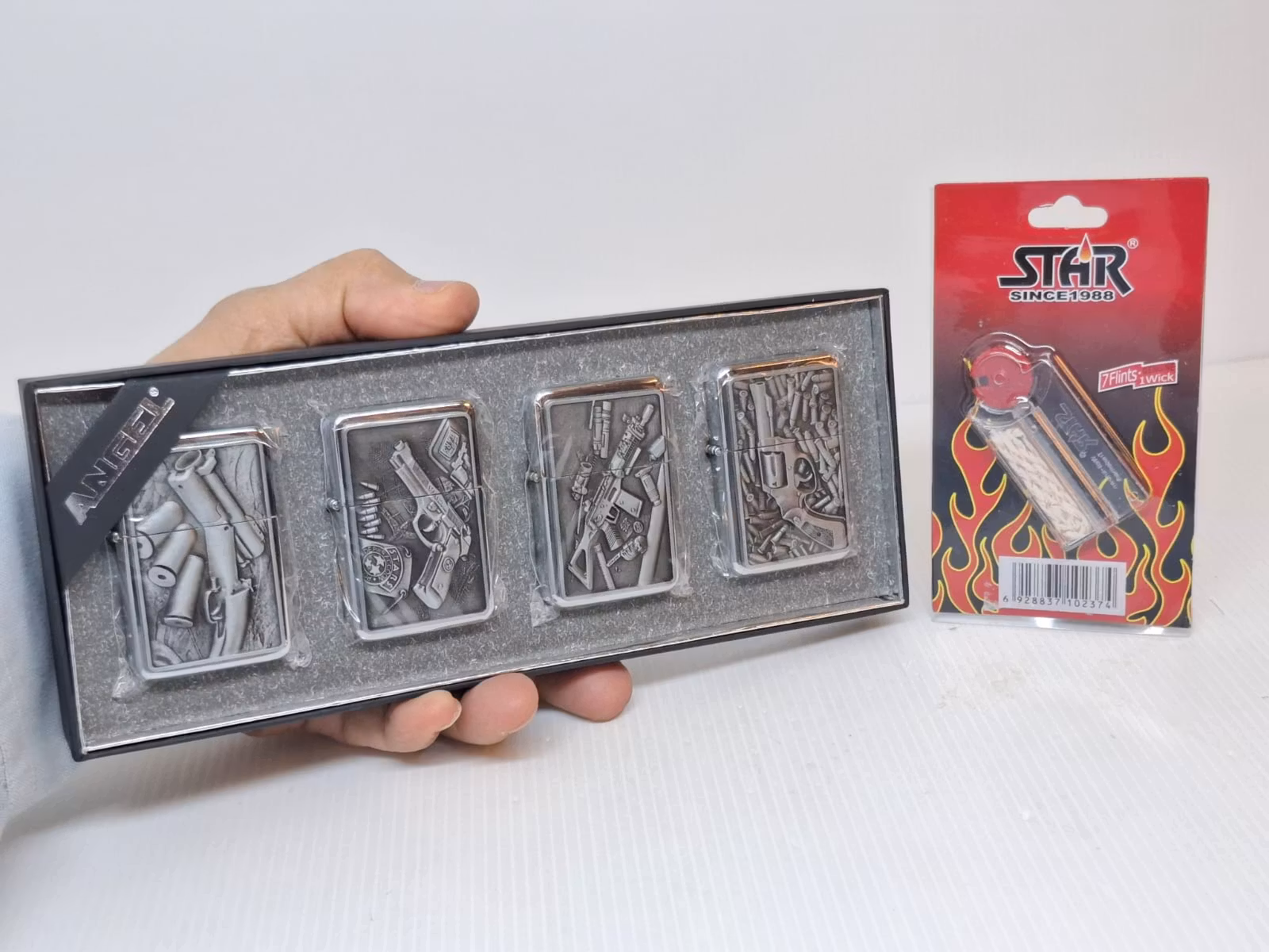 Du köper en display innehållande fyra bensin tändare av märket Angelo. Temat på bensintändare är vapen och pistoler.