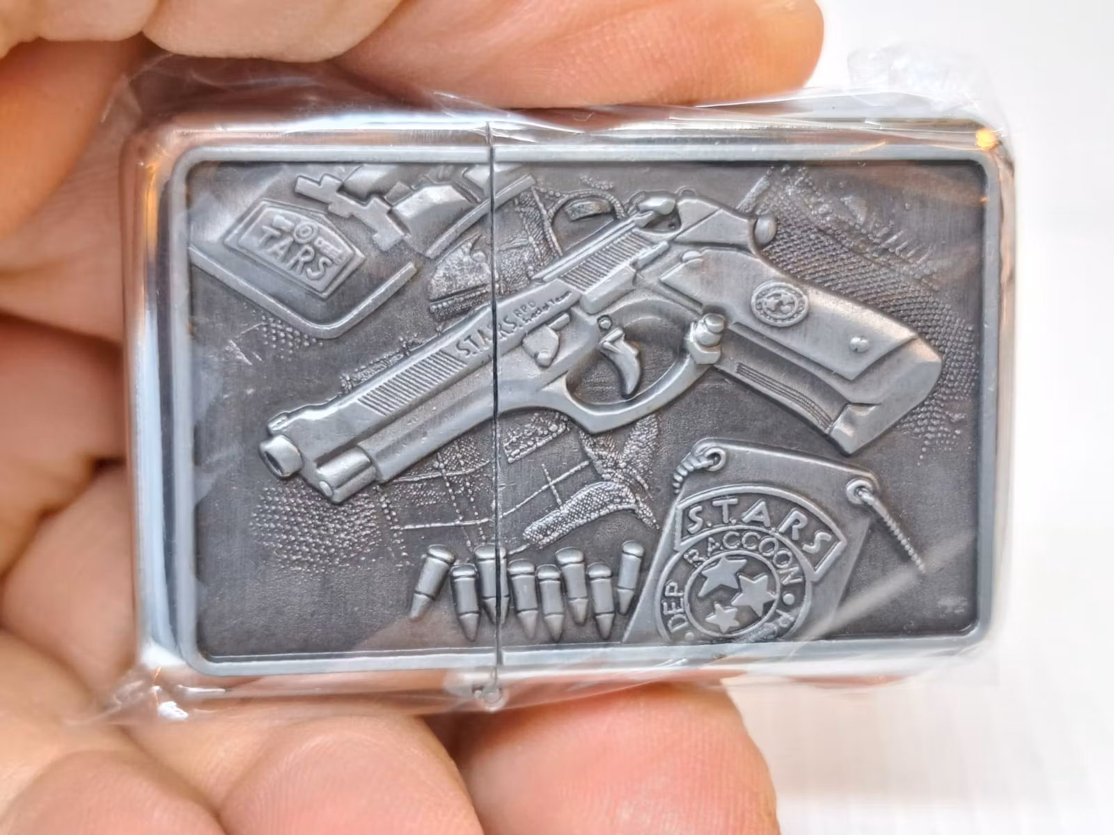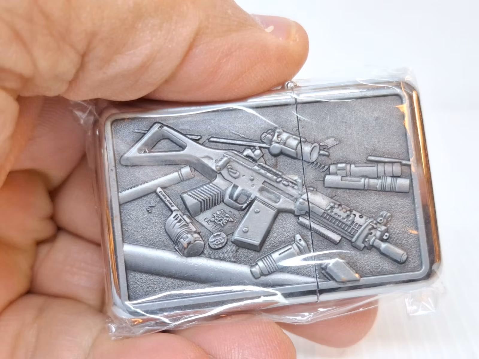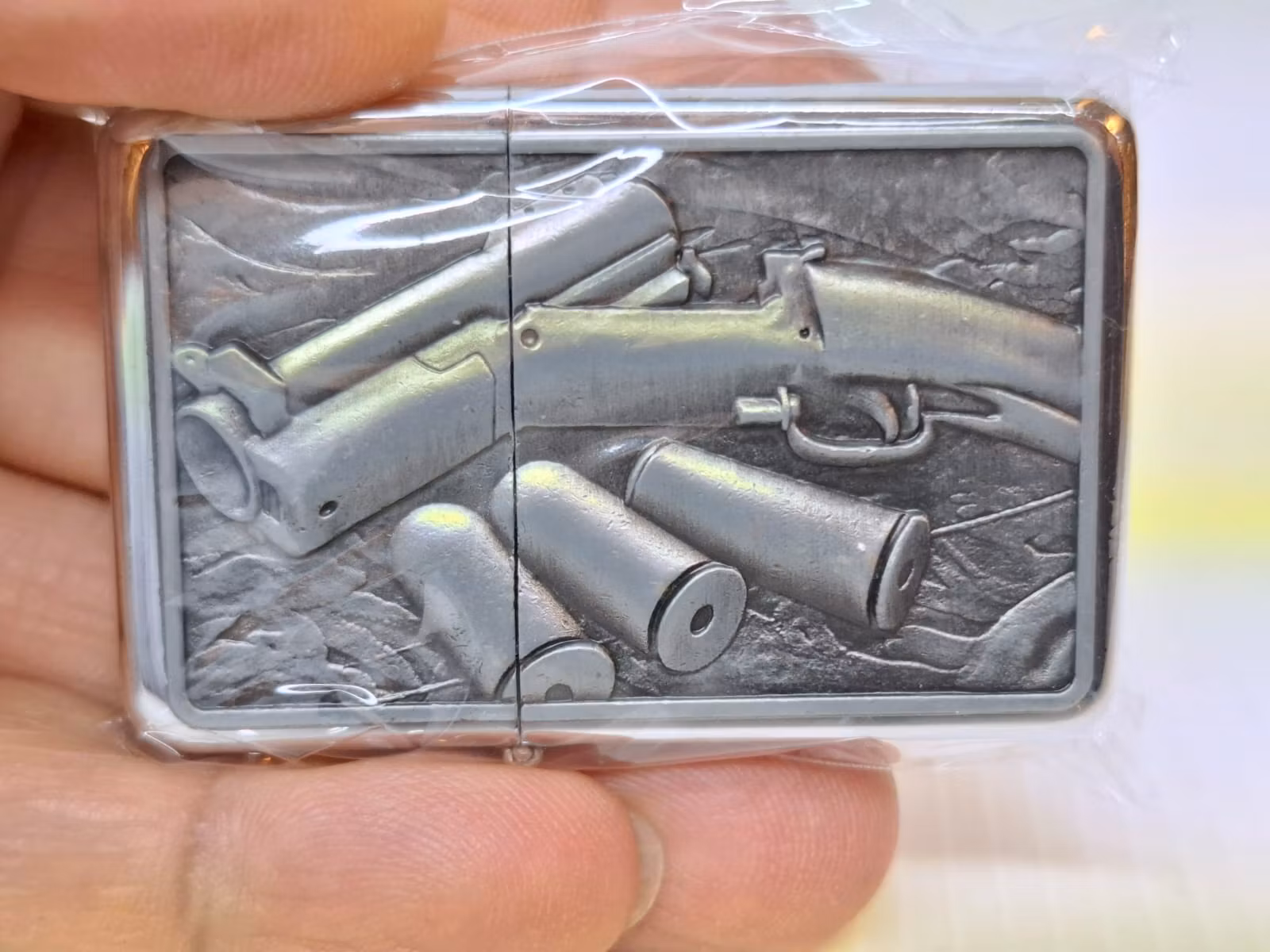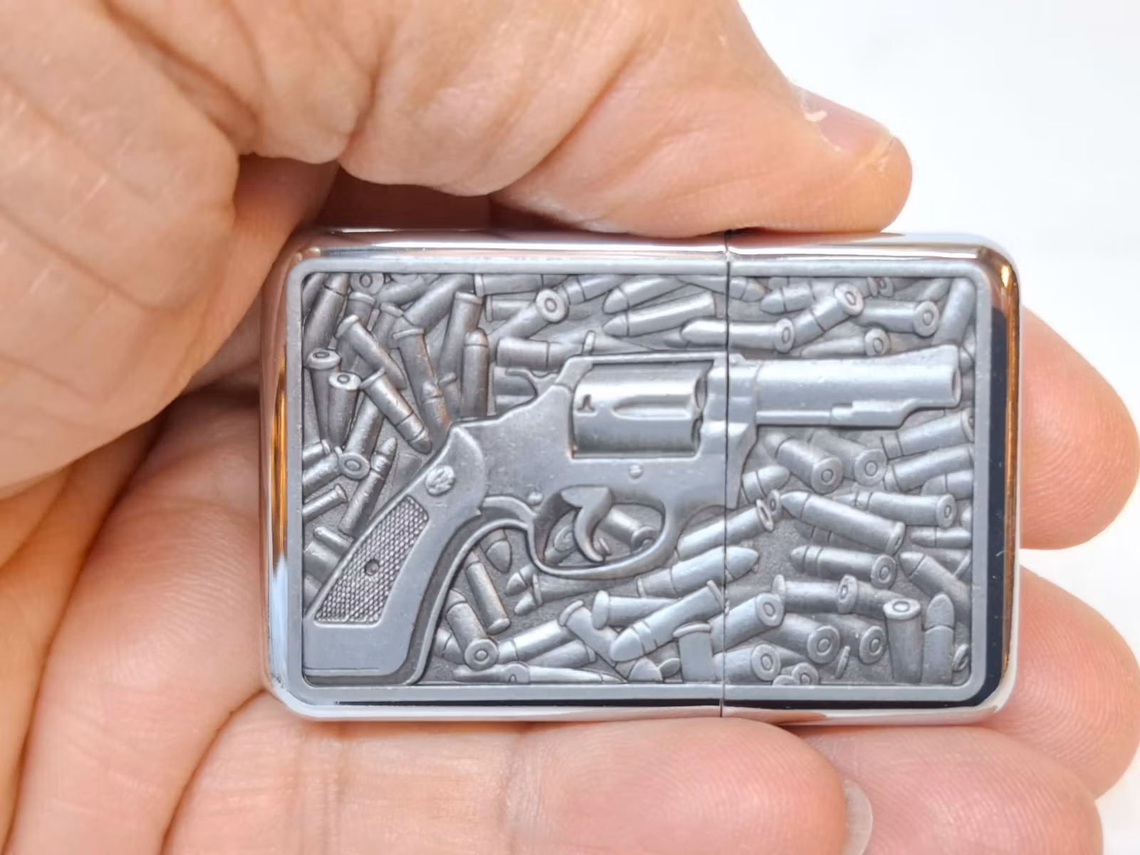 Du köper en display innehållande fyra bensin tändare av märket Angelo. Temat på bensintändare är vapen och pistoler.