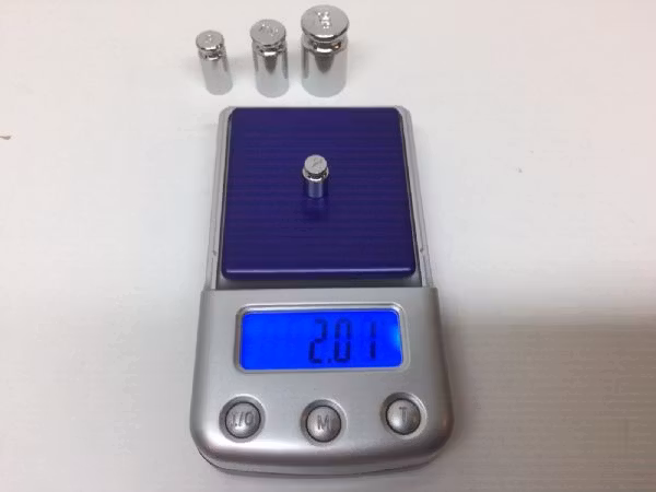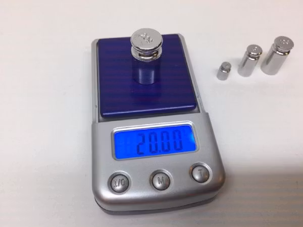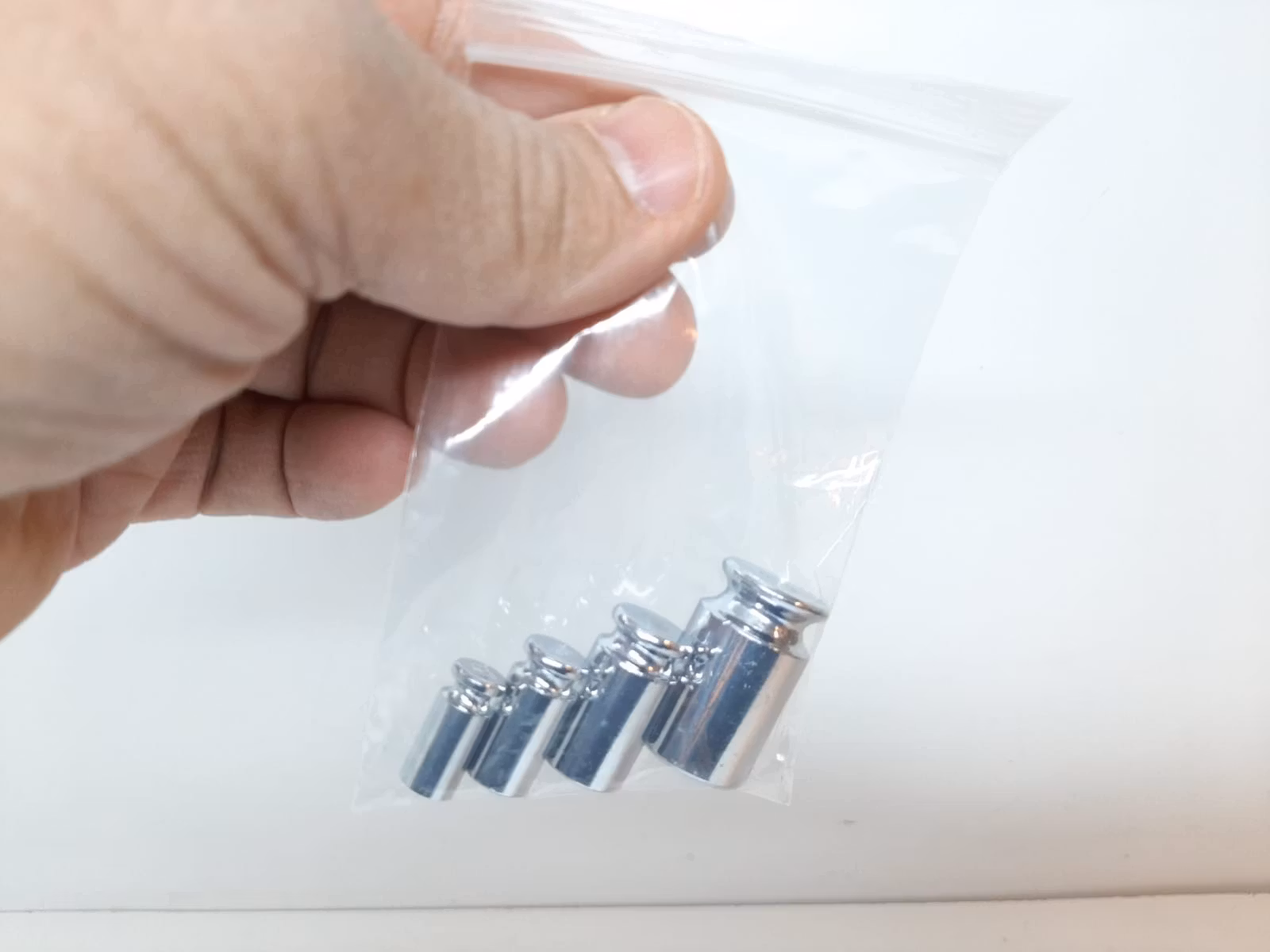2) 4 stycken vikter: 5 gram, 10 gram, 20 gram, 50 gram.